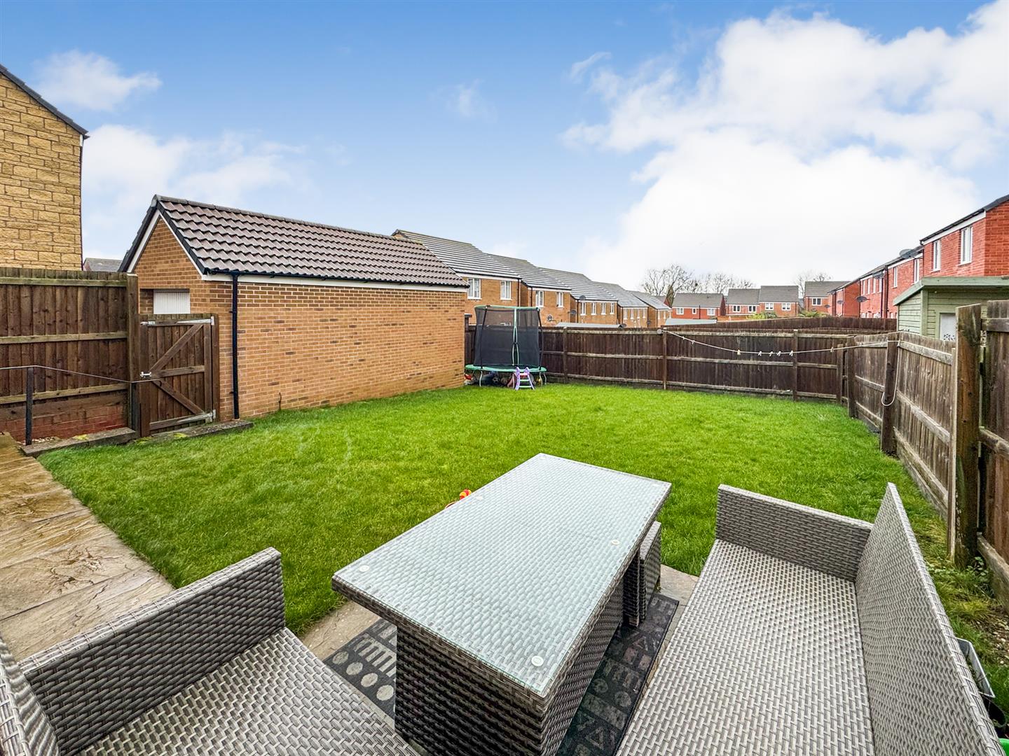 Rear: A large patio area leads onto a large laid lawn while the garden is enclosed by timber fencing to all sides.