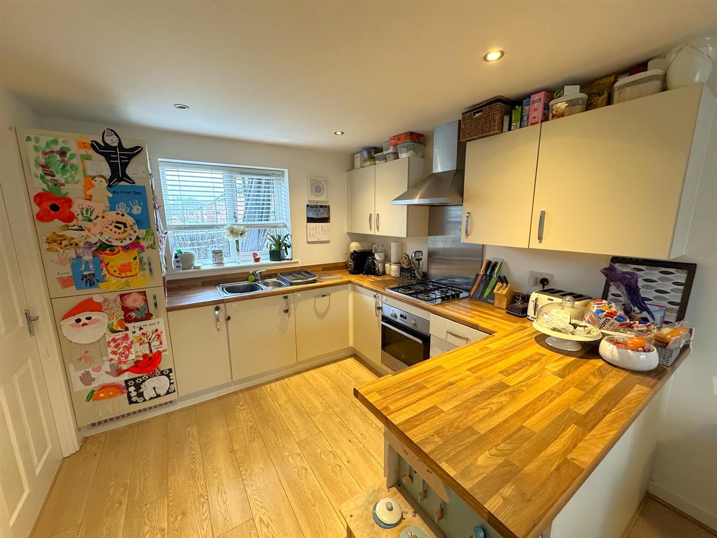 Fitted to comprise a range of base and eye level units with a one and a half bowl steel sink and drainer, gas hob with extractor, electric oven, integrated fridge/freezer, integrated dishwasher, double glazed window to front and rear elevation, radiator, under stairs storage, door to: