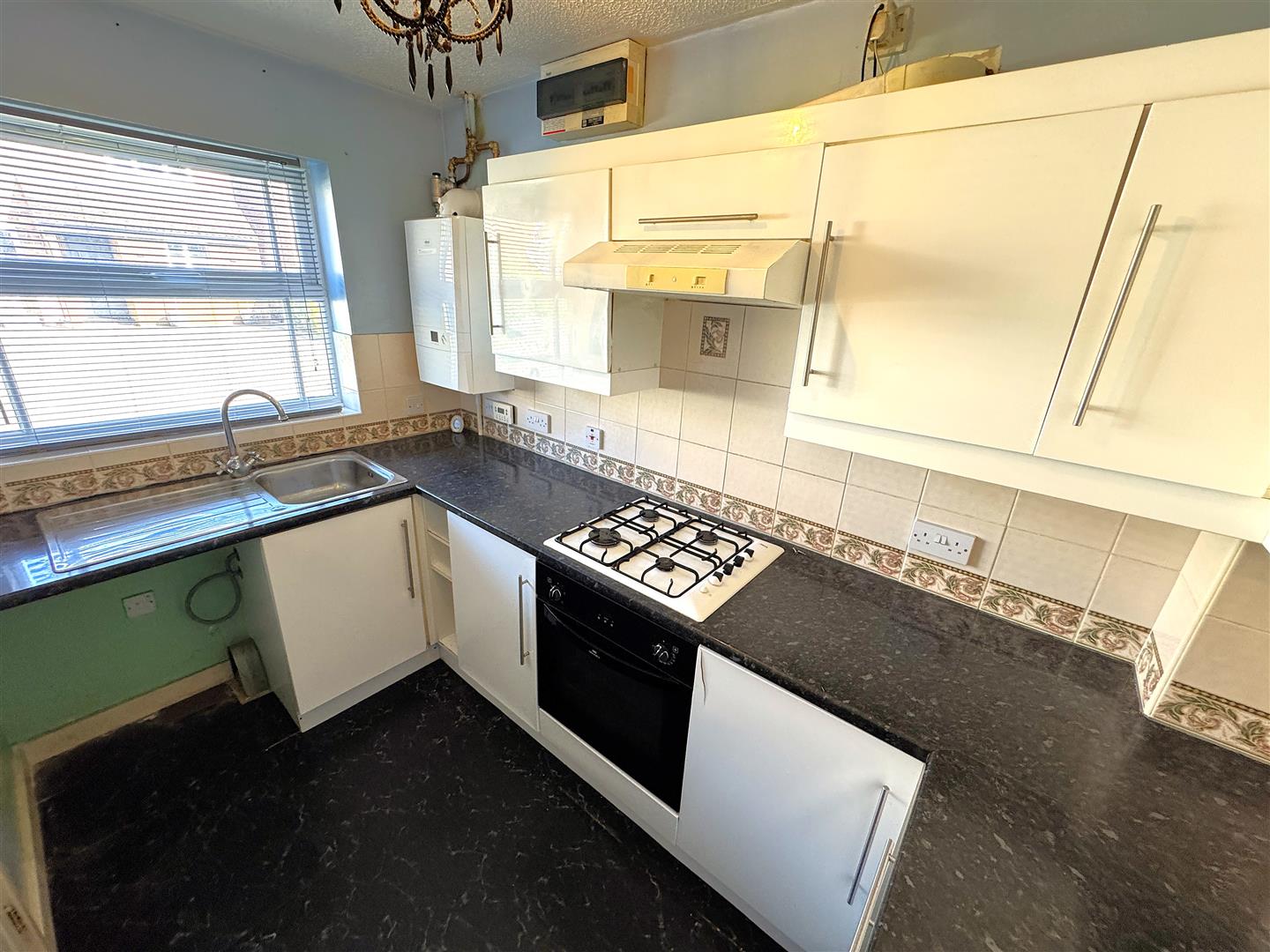 Fitted to comprise a range of base and eye level unts with a single steel sink and drainer, gas hob with extractor, electric oven, space for automatic washing machine, space for low level fridge/freezer, radiator, wall mounted boiler, double glazed window to front elevation.