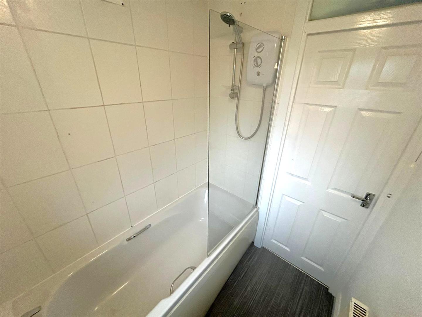 Obscure double glazed window to rear elevation, bath with chrome mixer tap over, pedestal wash hand basin, half tiling, radiator, wall mounted electric shower.