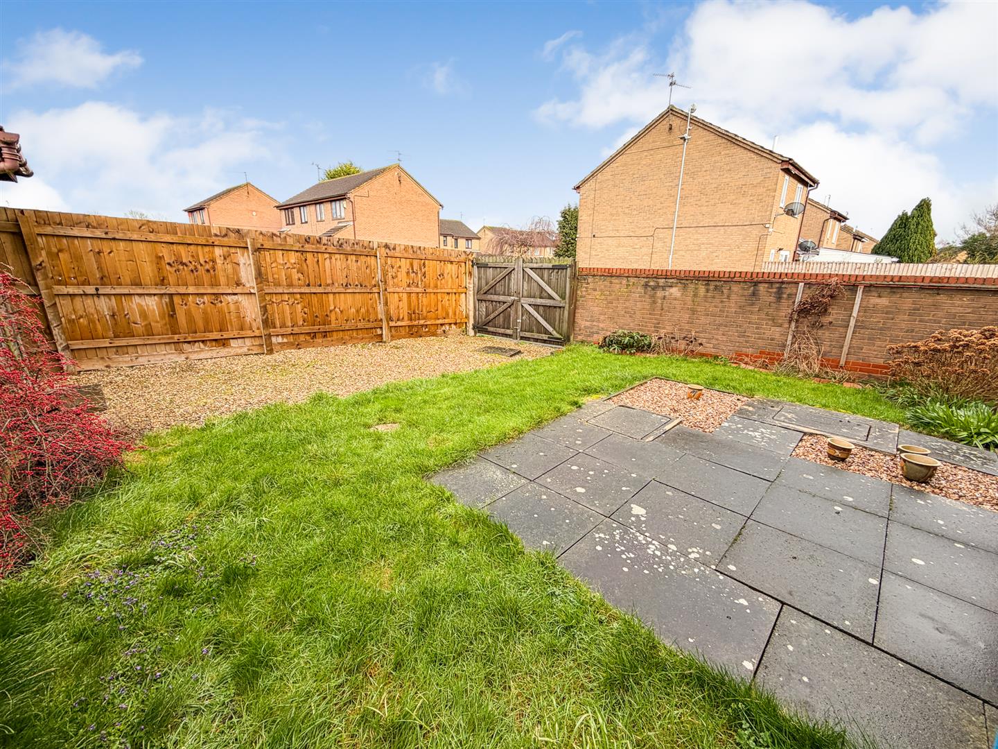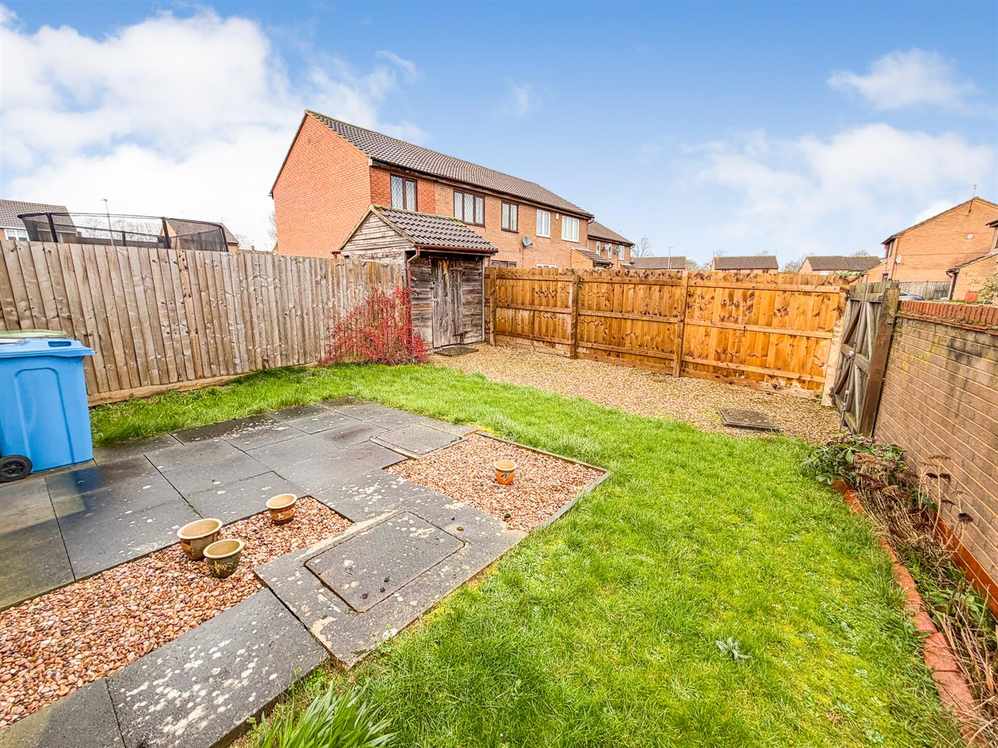REAR - A patio leads to a laid lawn, with driveway to rear and wooden built shed. Double gated access for parking.