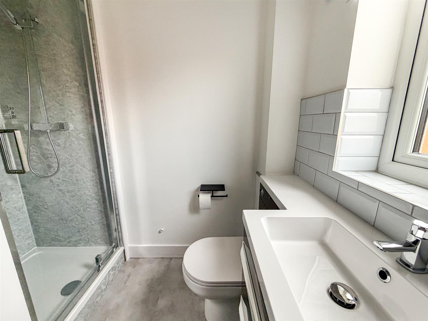 Fitted to comprise a three piece suite consisting of shower cubicle, low level wash hand basin, low level pedestal, radiator, double glazed window to rear elevation.