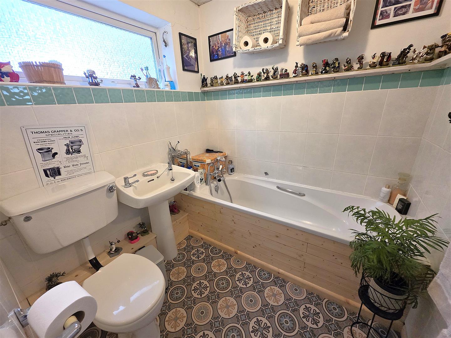 Fitted to comprise a three piece suite consisting of a panel bath with mixer shower tap , low level pedestal, low level wash hand basin, radiator, double glazed window to side elevation.