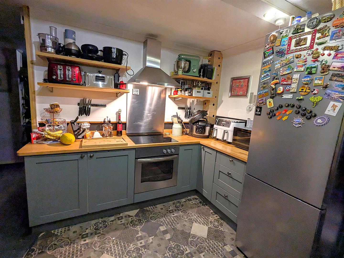 A fitted kitchen comprising a range of wall and base units, sink and drainer unit, an electric oven and induction hob with cooker hood over, space for fridge/freezer, double glazed window to the front elevation.