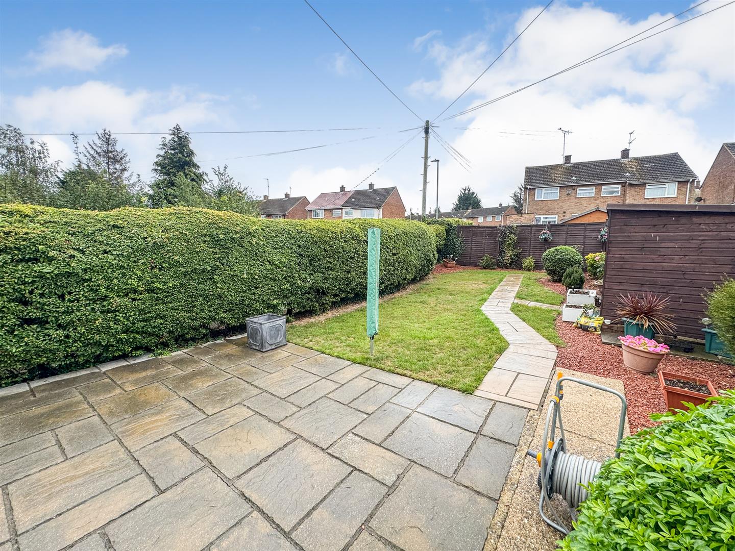 Rear: A landscaped garden featuring a mixture of slabbing, laid lawn, pebble dash and mature shrubbery and plant, enclosed to all sides by timber fencing and mature shrubbery.