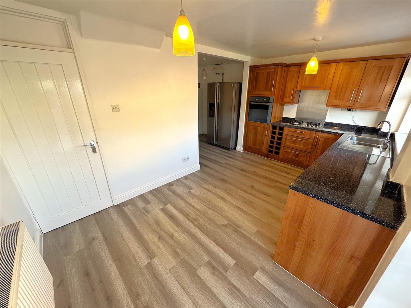 Fitted to comprise a range of base and eye level units with a one bowl sink and drainer, space for a dishwasher, integrated oven with gas hob, space for free standing fridge, radiator, double glazed window to the rear elevation, double glazed French doors to rear, opening to: