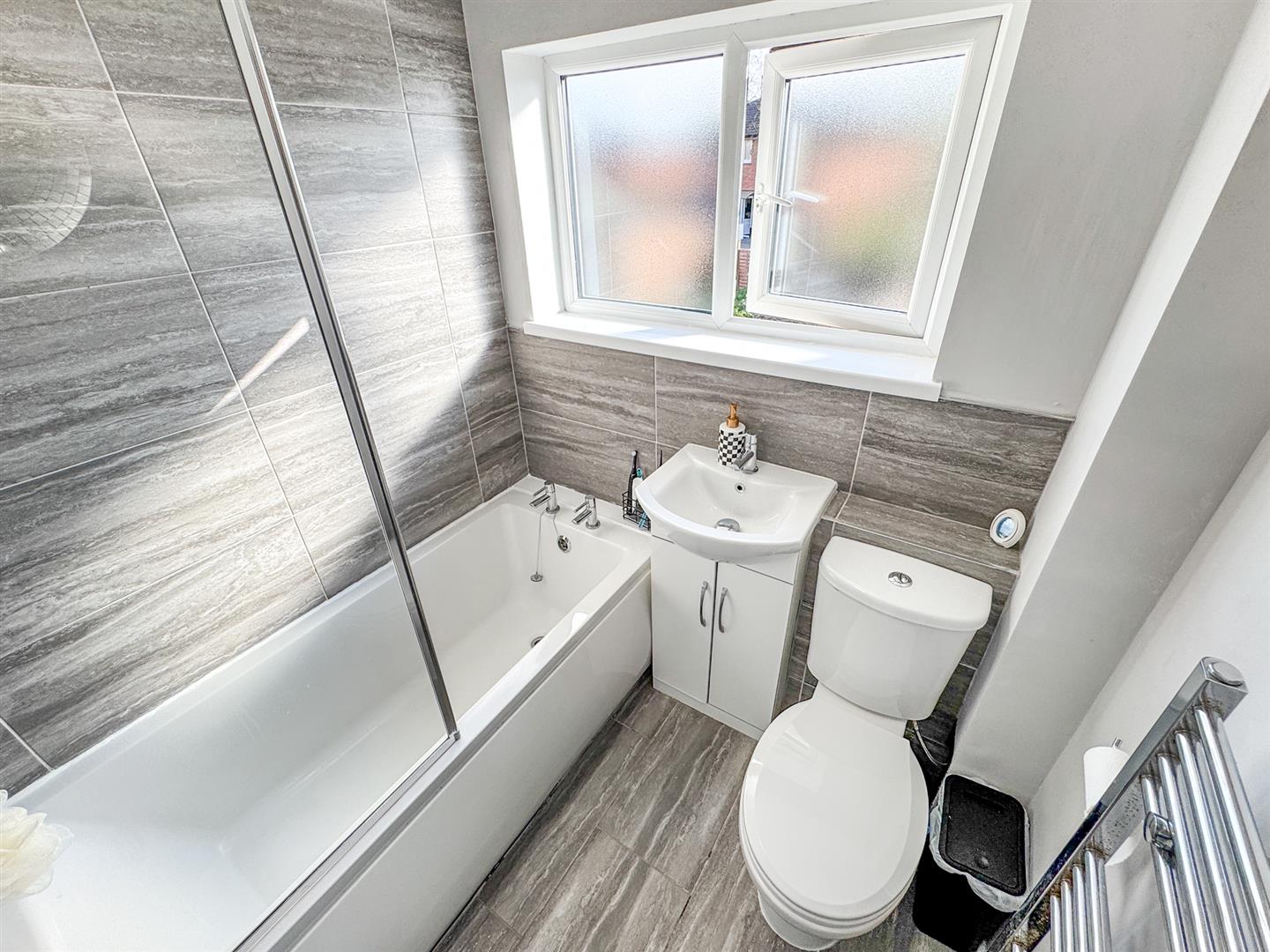 Fitted to comprise a three piece suite consisting of a panel bath with shower over, low level wash hand basin, low level pedestal, radiator, double glazed window to rear elevation.