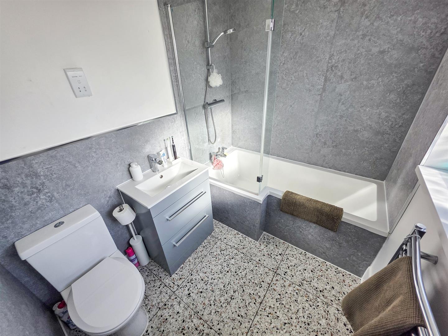 Re-fitted to comprise a three piece suite with a panel bath with shower over, a low level pedestal. a low level wash hand basin, radiator, double glazed window to rear elevation.