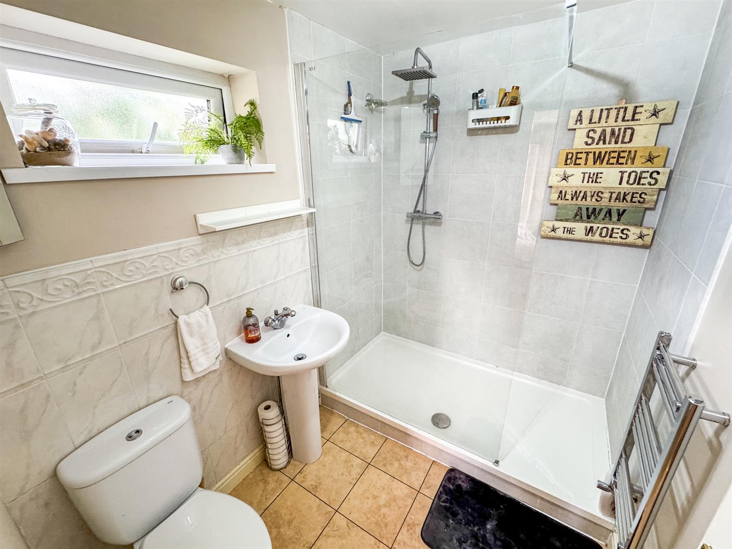 Fitted to comprise a three piece suite consisting of a walk in double shower cubicle, low level wash hand basin, low level pedestal, radiator, extractor fan