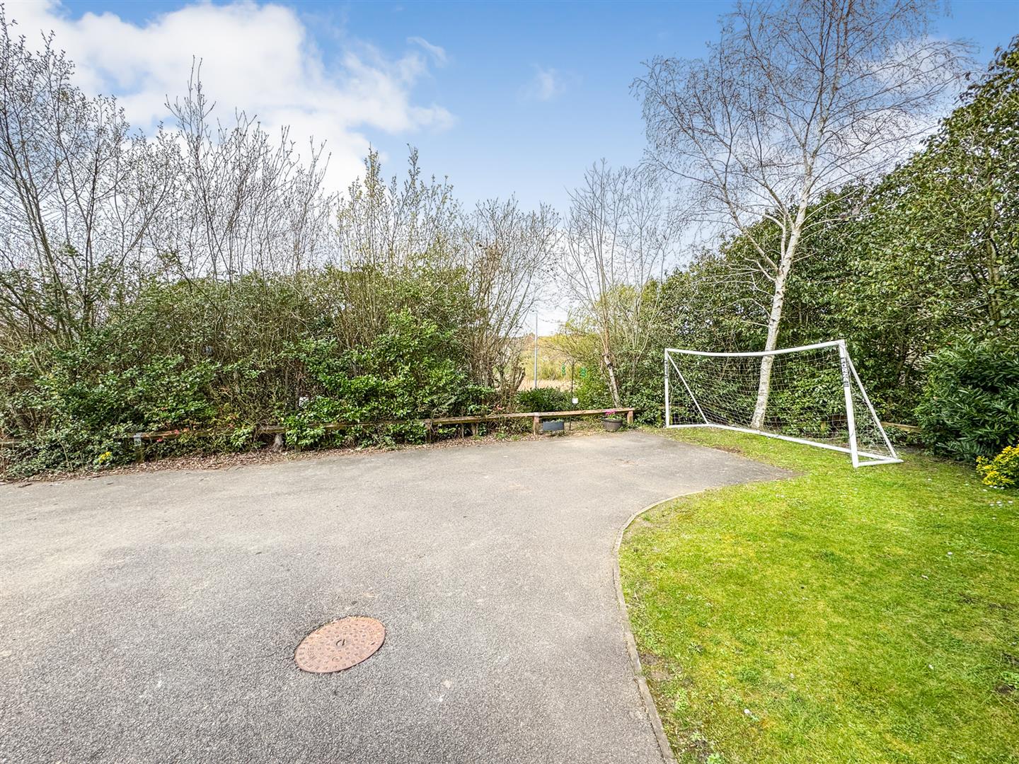 Front: A large driveway provides off road parking for multiple vehicles and this leads to a laid lawn and a detached garage.