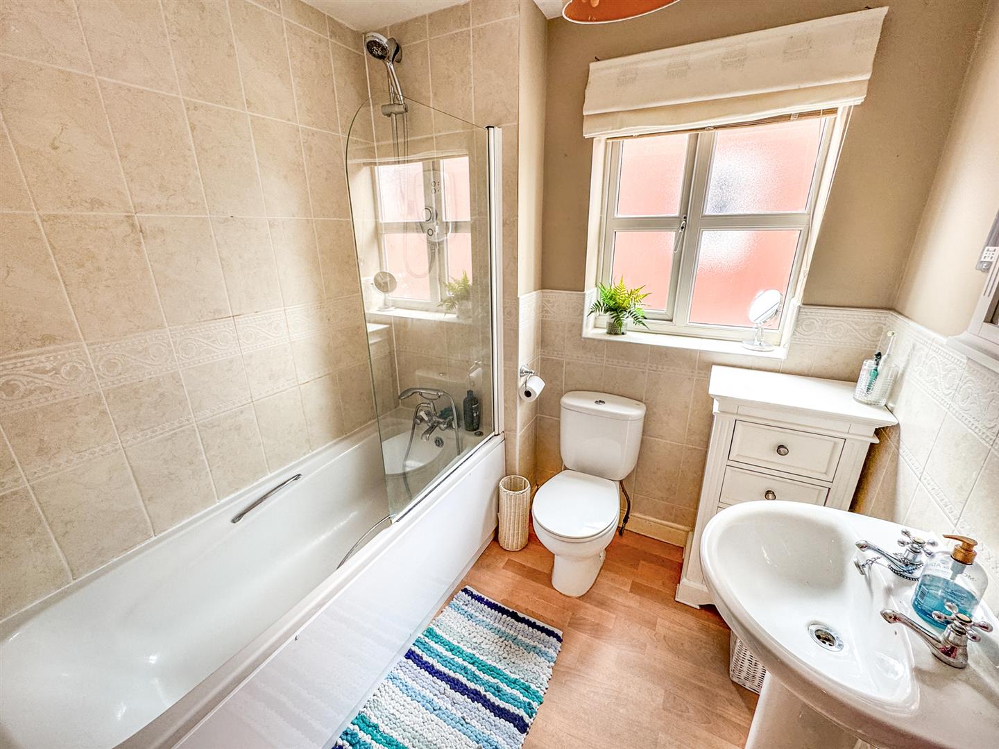 Fitted to comprise a three piece suite consisting of a panel bath, low level wash hand basin, low level pedestal, radiator, double glazed window to front elevation.