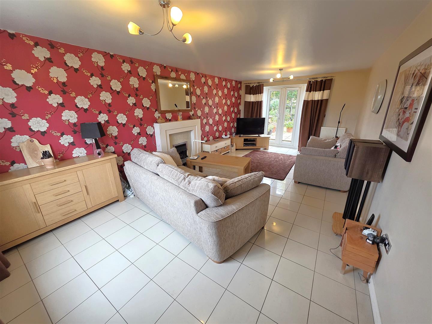 Fitted to comprise a range of base and and eye level units with a sink and drainer, integrated gas hob with double electric oven and extractor, integrated fridge/freezer, space for dishwasher, radiator, double glazed doors to side elevation, double glazed windows to rear elevation, tv point.