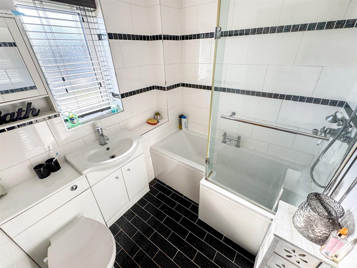 Fitted to comprise of a low level pedestal, low level hand wash basin with vanity unit, L shaped panel bath with overhead system shower, radiator, double glazed window to front elevation.