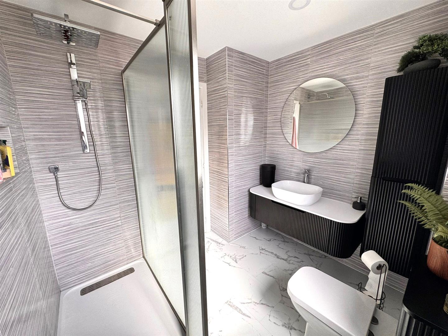 Upstairs offers four generous double bedrooms—two with built-in wardrobes and two furnished with bedroom furniture. The master suite enjoys an en-suite shower room and air conditioning, while a newly fitted contemporary shower room serves the remaining rooms.