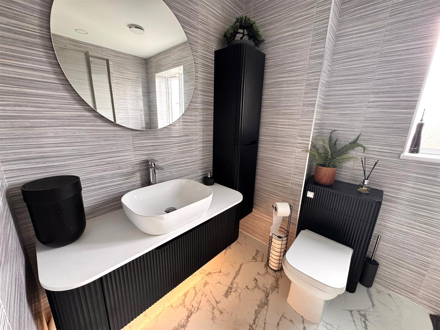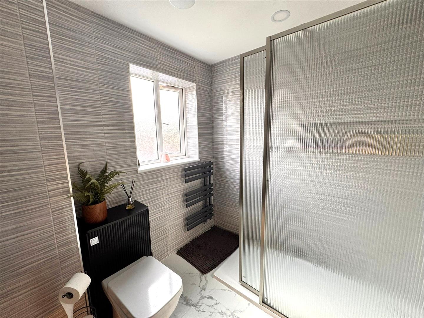 The low-maintenance garden features decking, covered seating, artificial lawn, and direct access to the converted garage, ideal as a games room, studio, or office.