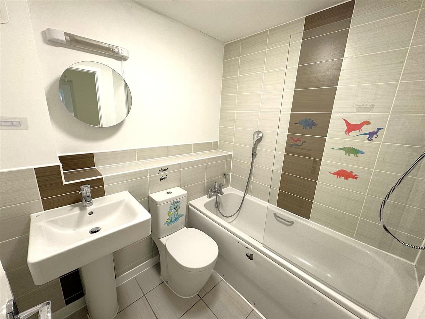 Fitted to comprise a three piece suite consisting of a panel bath with shower head, low level wash hand basin, low level pedestal, radiator.