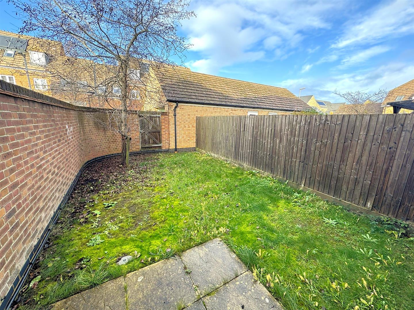 Rear: A patio area leads onto a laid lawn and has gated access to the rear.
