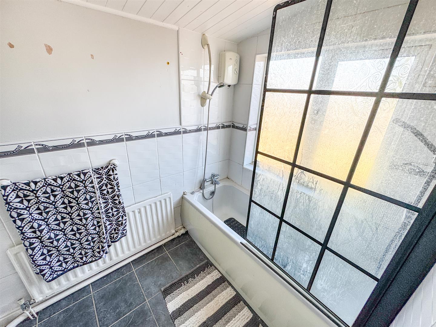 Fitted to comprise a three piece suite comprising of a three piece suite consisting of a panel bath with mixer shower tap, low level wash hand basin, low level pedestal, radiator, double glazed window to side elevation.