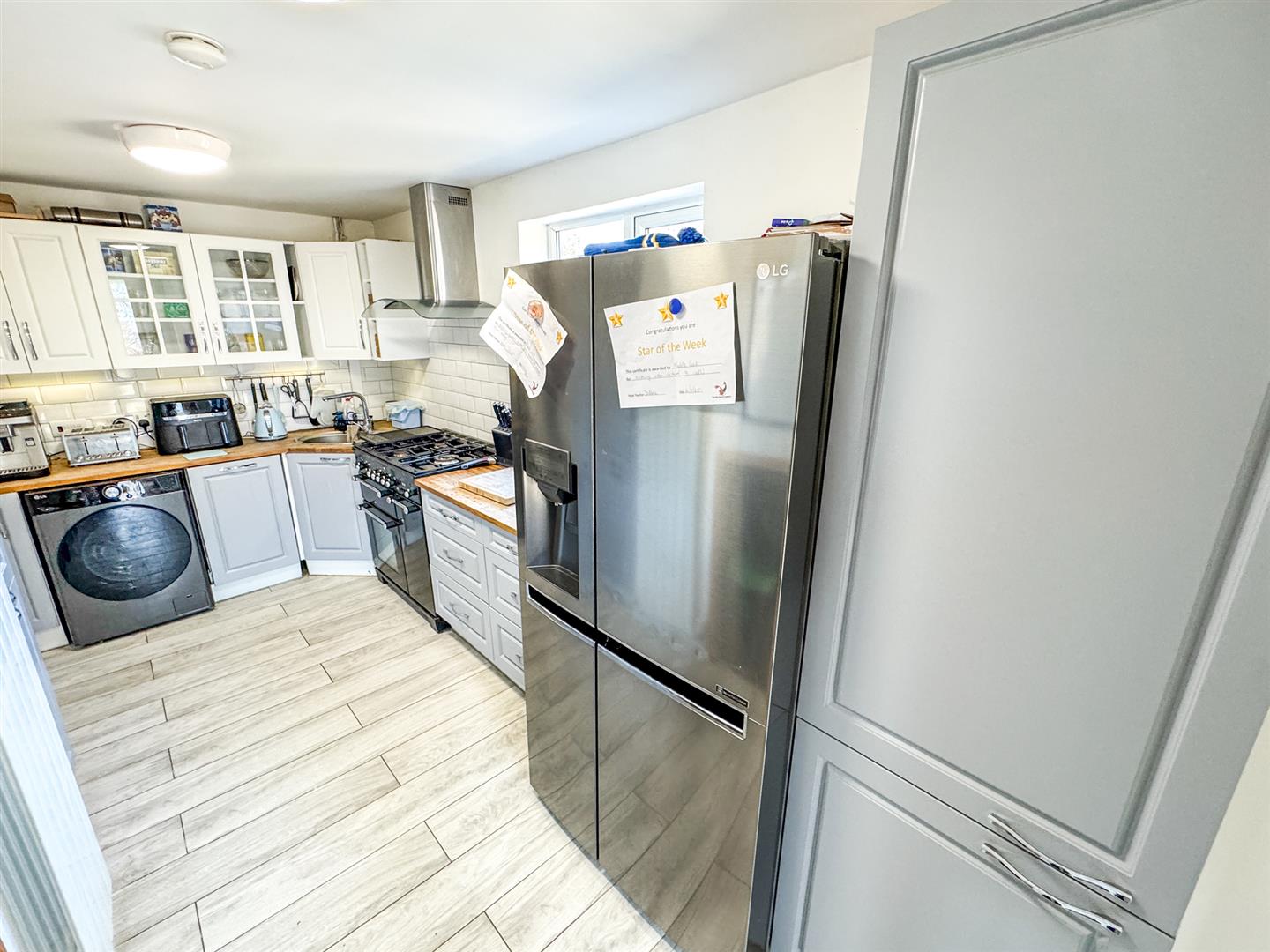 Fully refitted to comprise a range of base and eye level units with a sink and drainer, free standing range cooker with gas hob and electric oven with extractor, space for double American Fridge/freezer, space for automatic washing machine, integrated dishwasher, under stairs storage cupboard, double glazed window to the side elevation.
