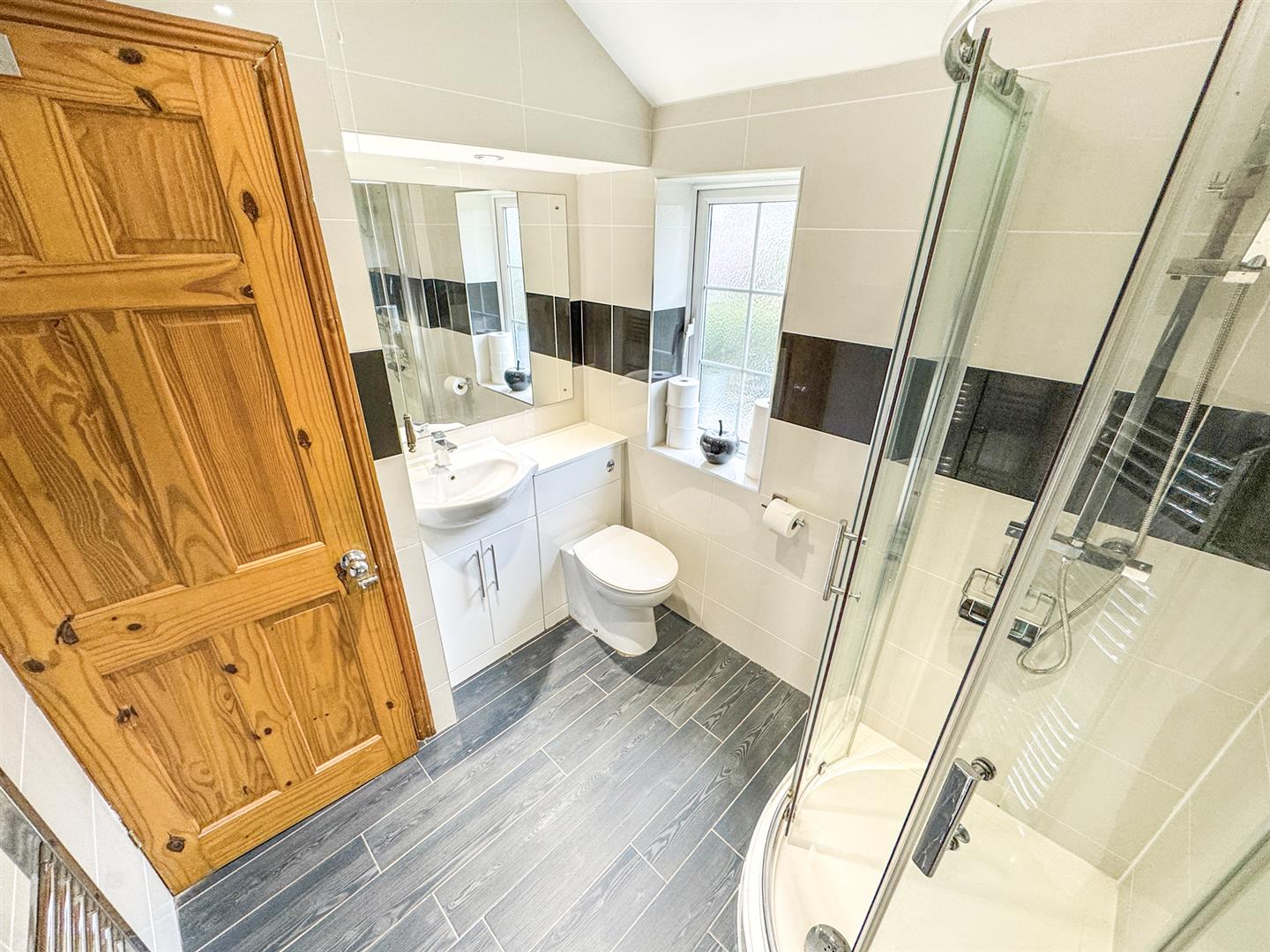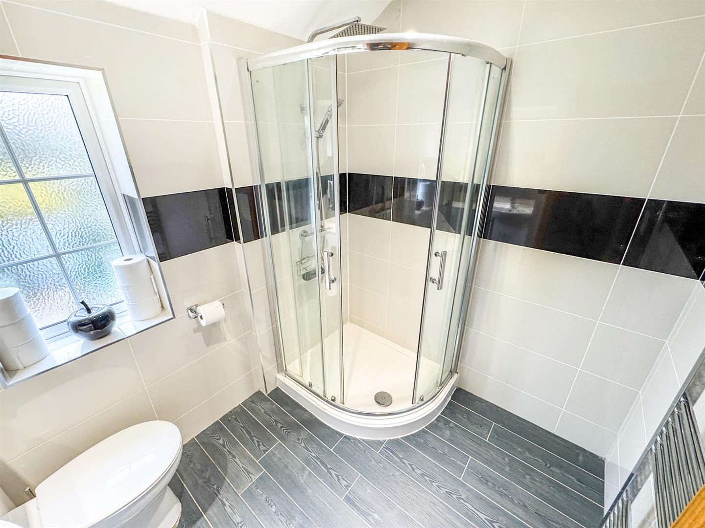 Fitted to comprise a three piece suite consisting of a mains feed shower cubicle, low level wash hand basin, low level pedestal, radiator, double glazed window to rear elevation.