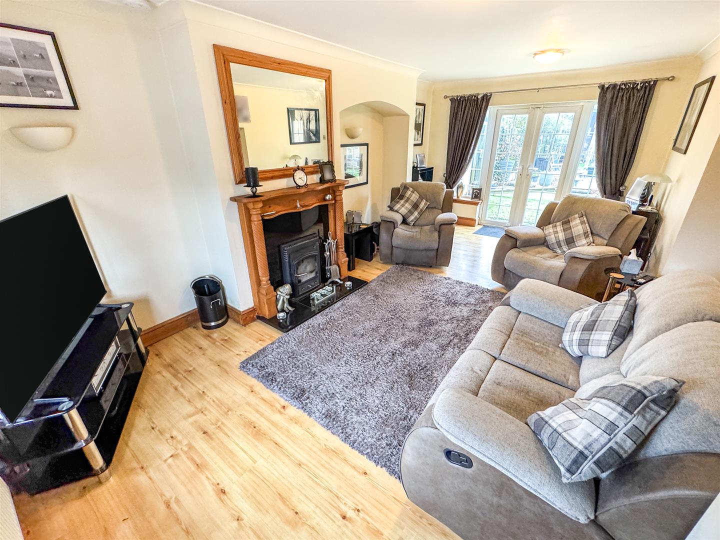 Double glazed window to front elevation, radiator, Tv point, telephone point, Double glazed French doors to rear elevation, under stairs storage area, multi fuel burner.