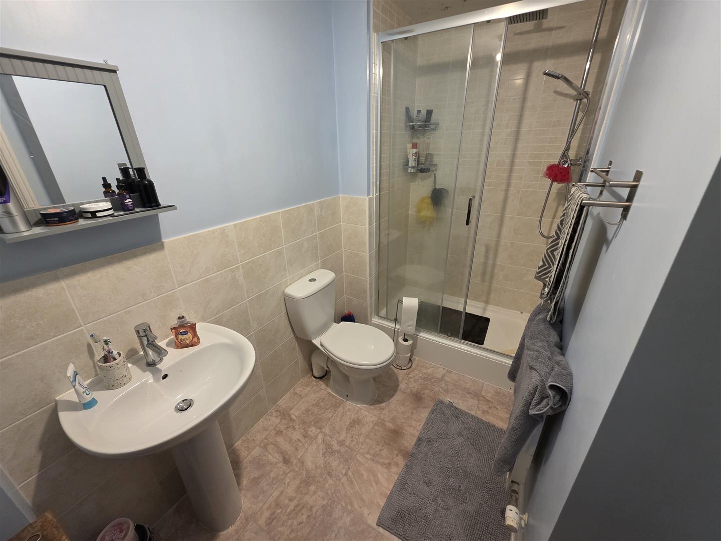 Fitted to comprise a three piece suite consisting of a walk in mains feed double shower cubicle, low level pedestal, low level wash hand basin, radiator, extractor fan and double glazed window to front elevation.