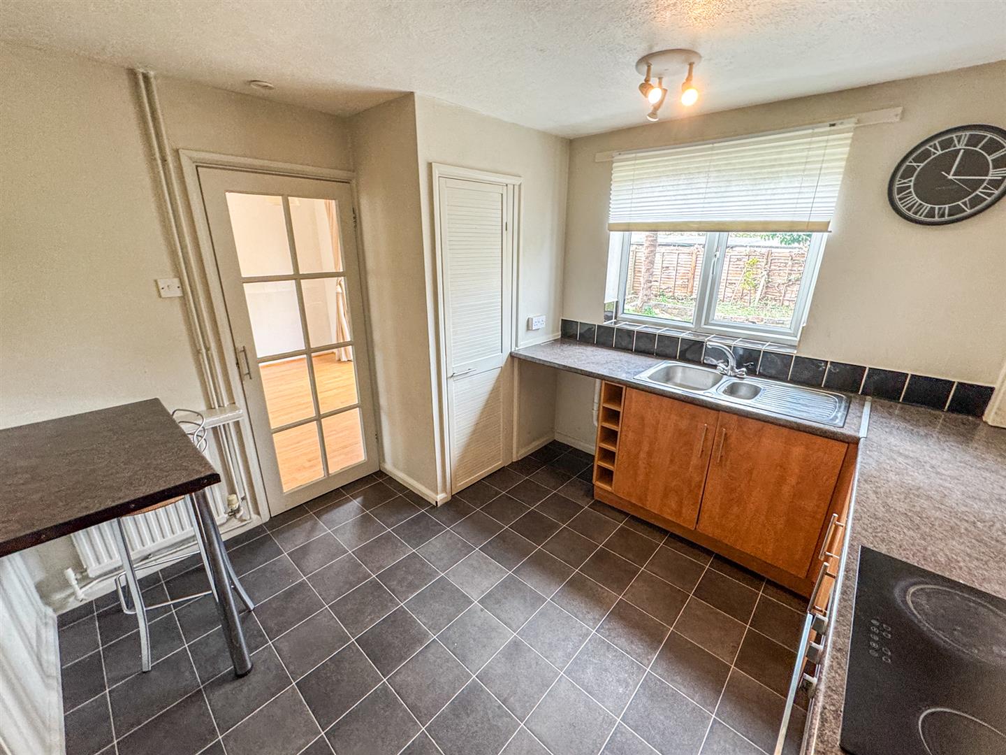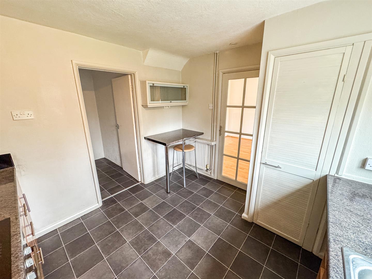 Fitted to comprise a range of base and eye level units with a one and a half bowl sink and drainer, electric hob and extractor, electric oven, space for automatic washing machine, pantry cupboard, radiator, breakfast bar, double glazed window to rear elevation, door to: