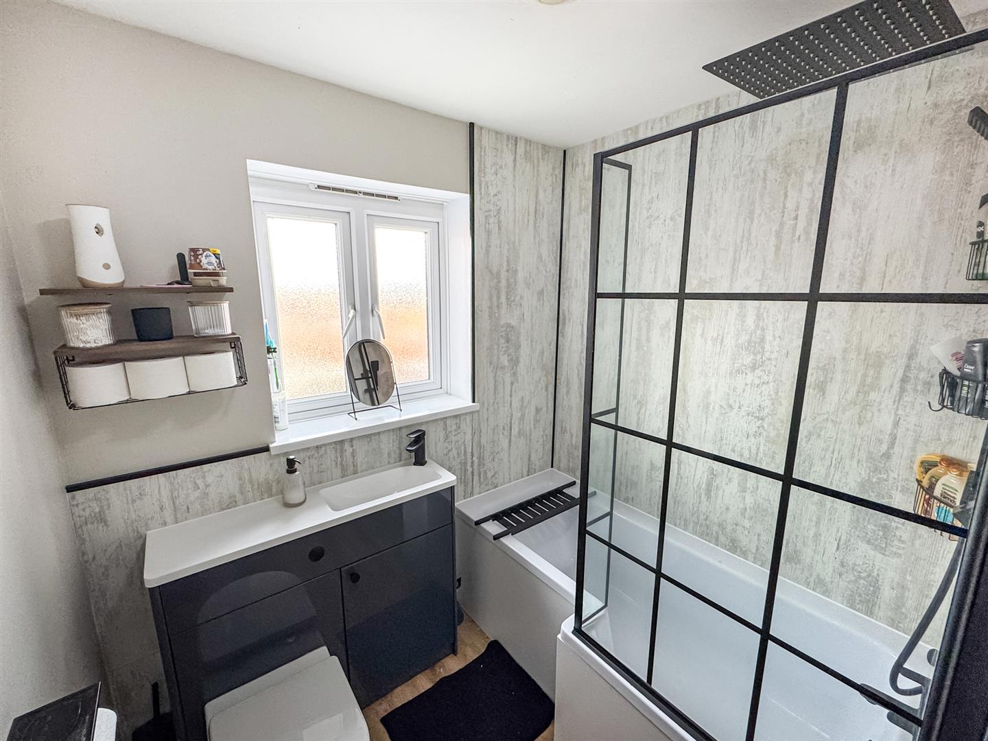 Fitted to comprise a three piece suite consisting of a P shaped bath with mains feed shower over, low level wash hand basin, low level pedestal, radiator, double glazed window to rear elevation.