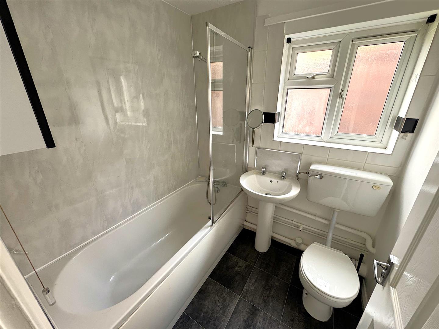Fitted to comprise a three piece suite consisting of a panel bath with mixer shower tap, low level pedestal, low level wash hand basin, radiator, double glazed window to side elevation.