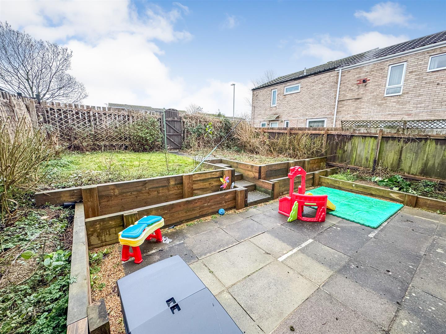Rear: A large patio area leads to a raised laid lawn and planting area with timber fencing to all sides and gated access to the rear.
