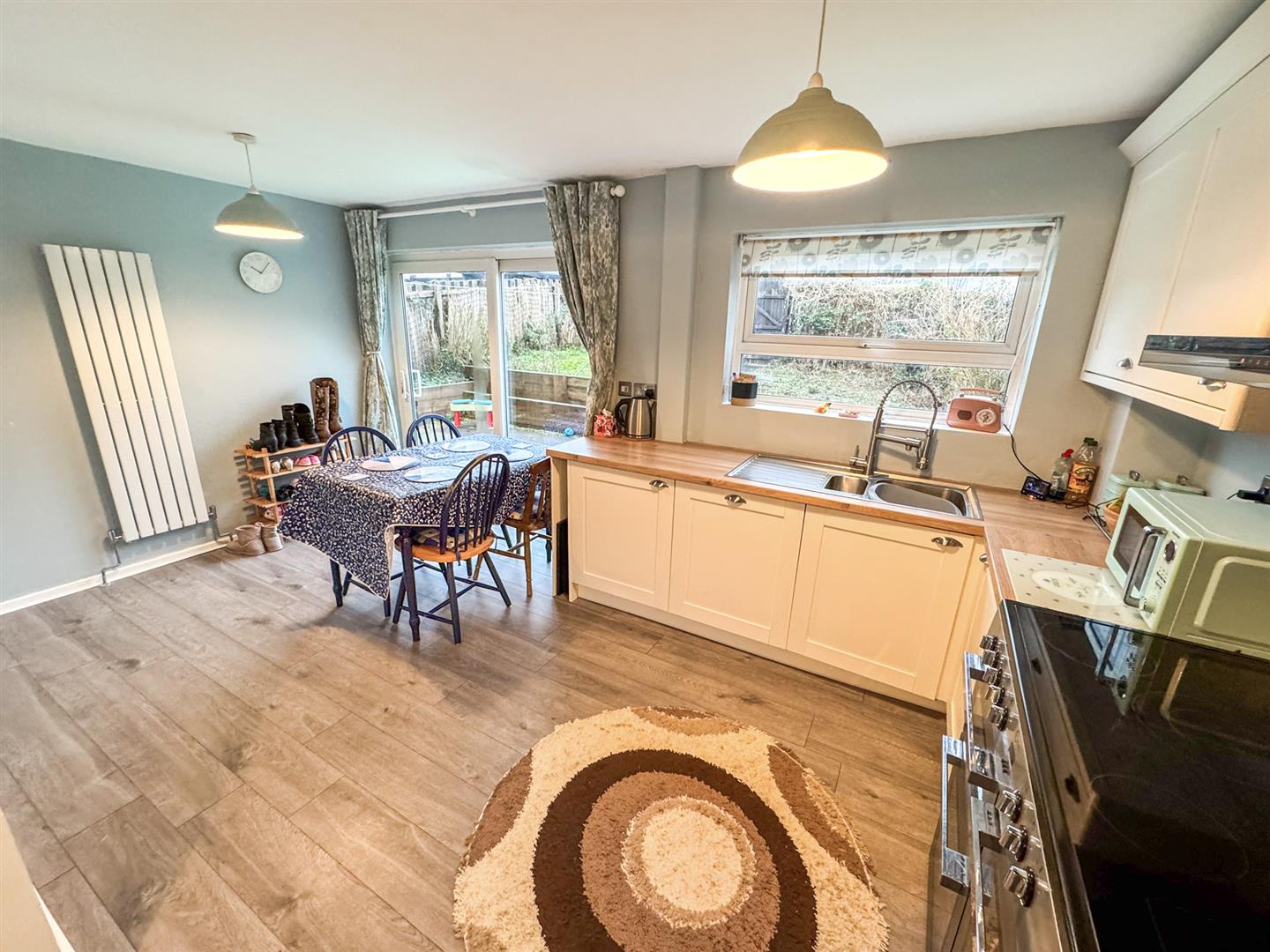 Fitted to comprise a range of base and eye level units with a one and a half bowl steel sink and drainer, space for free standing fridge/freezer, space for automatic washing machine, integrated dishwasher, double glazed window to front and rear elevation, radiator, double glazed French doors to rear elevation.