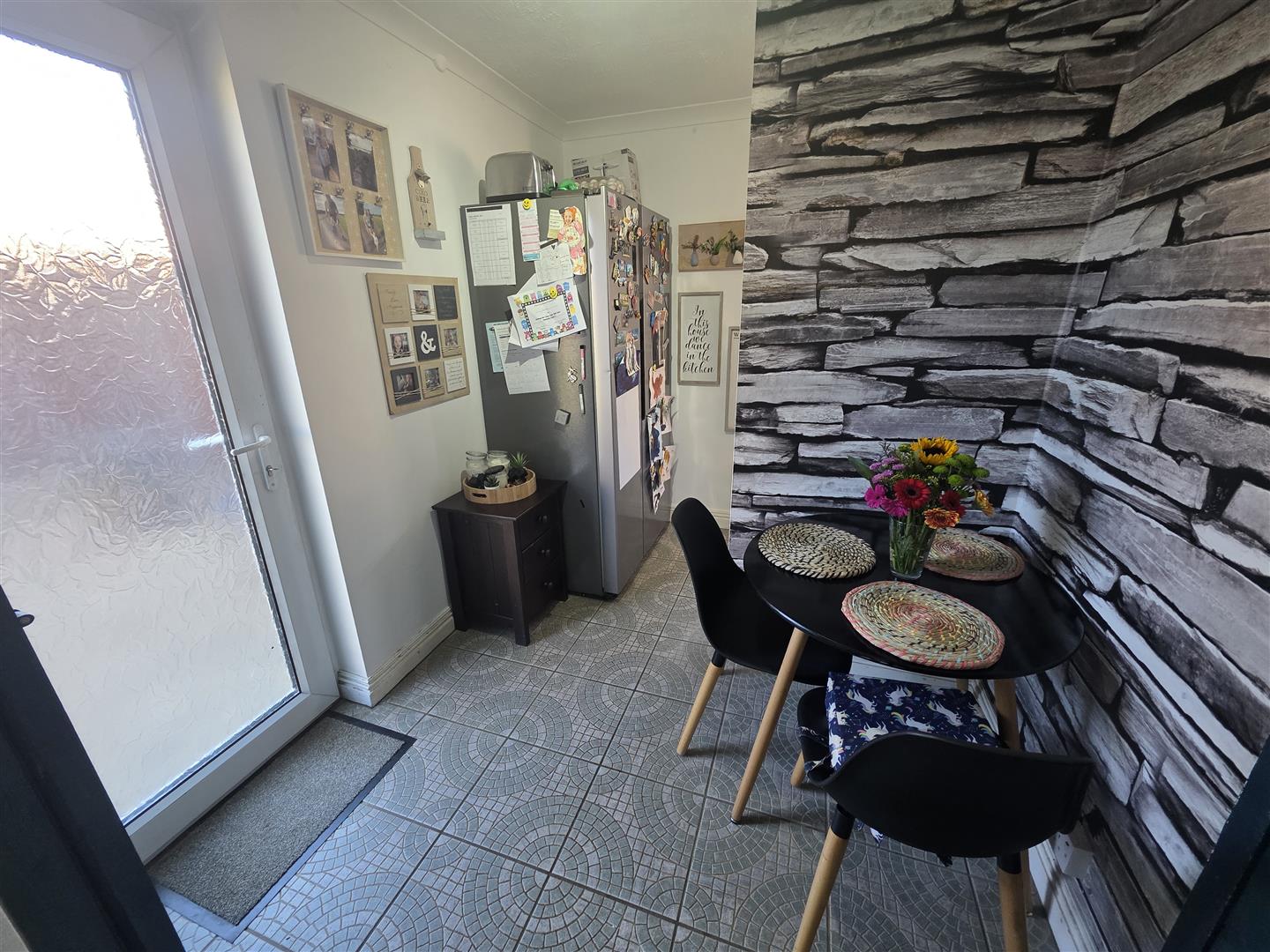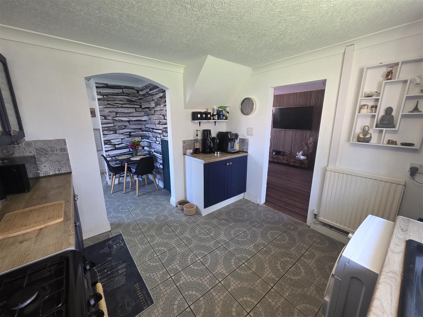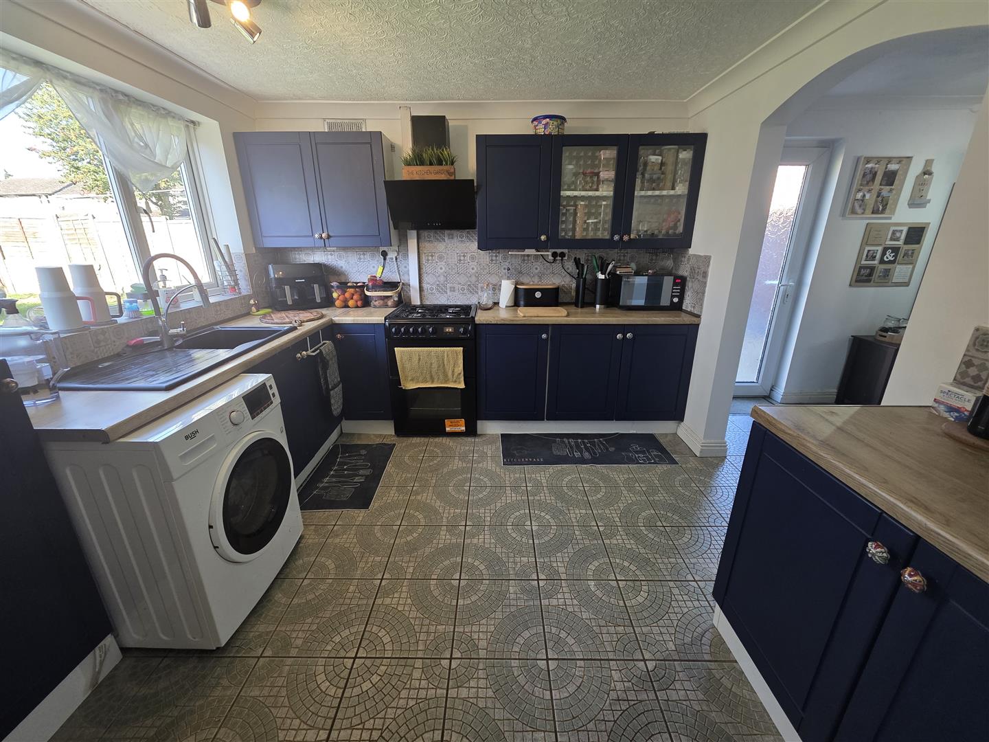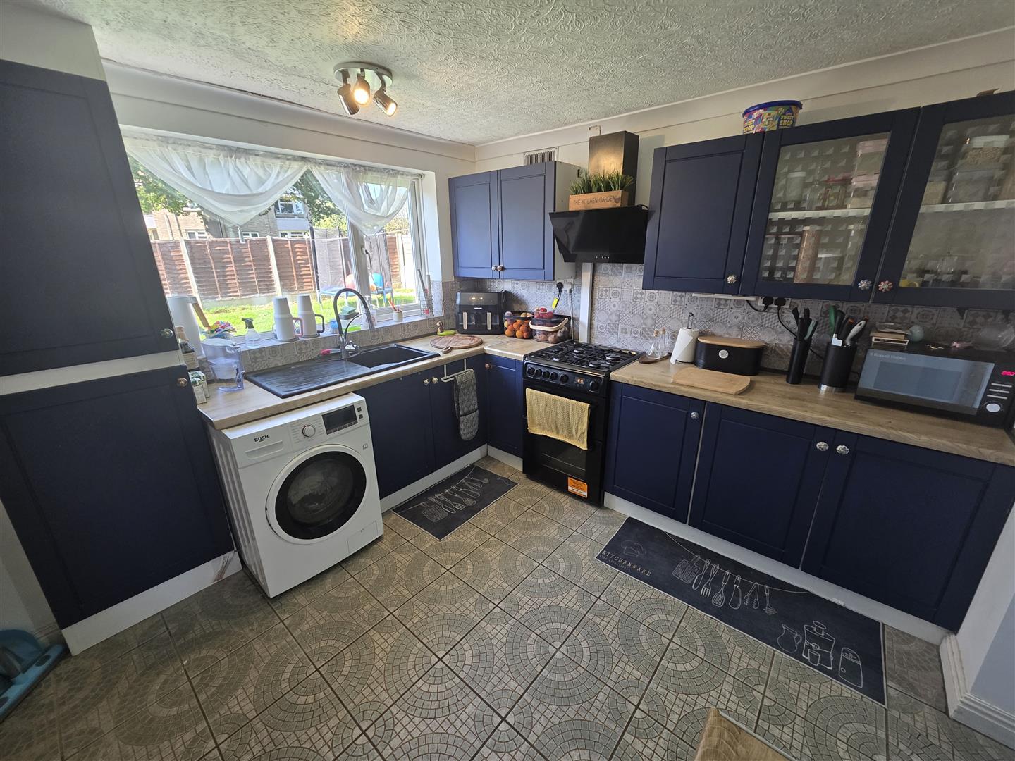 Fitted to comprise a range of base and eye level units, sink and drainer, space for automatic washing machine, electric oven with gas hob and overhead extractor, wall mounted combi boiler, radiator, double glazed window to rear elevation.
