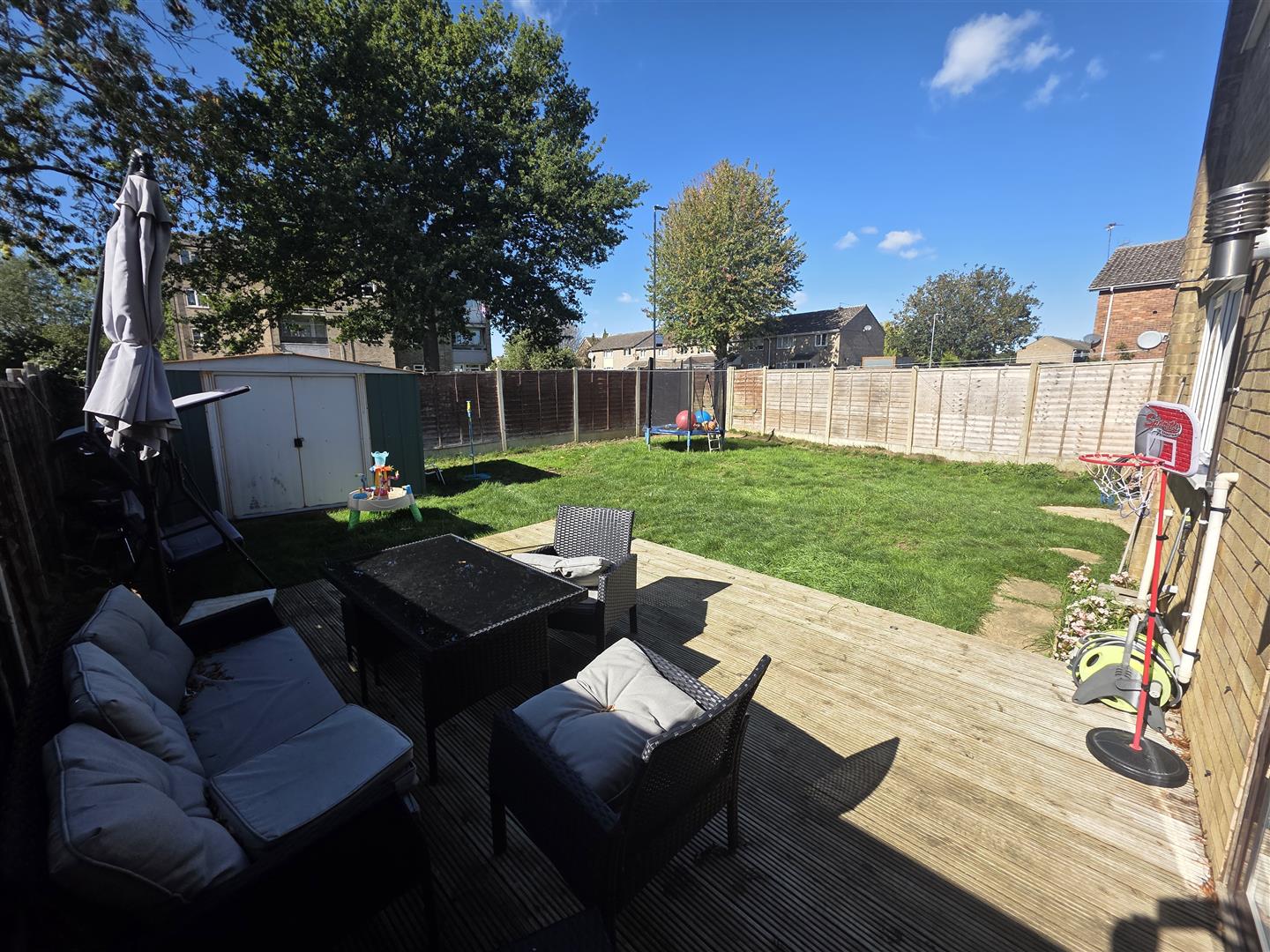 REAR - A spacious garden made up of a mixture of a large laid lawn, decking area and patio, enclosed to all sides by timber fencing.