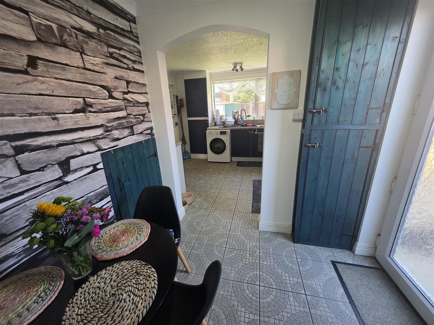 Space for american fridge/freezer, storage cupboard, under-stair storage, radiator, double glazed door to side elevation.
