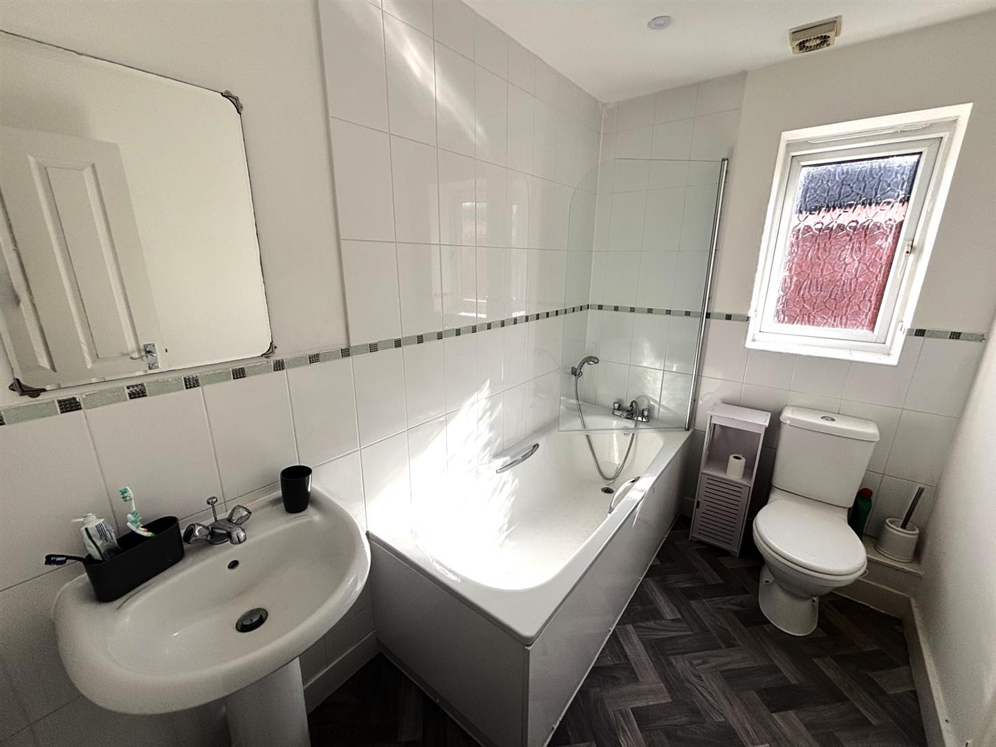 Fitted to comprise a three piece suite consisting of a panel bath with mixer shower tap, low level pedestal, low level wash hand basin, radiator, double glazed window to side elevation.