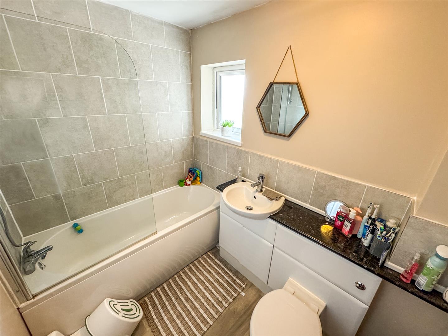 Fitted to comprise a three piece suite consisting of a panel bath with shower over, low level wash hand basin, low level pedestal, radiator, double glazed window to side elevation.