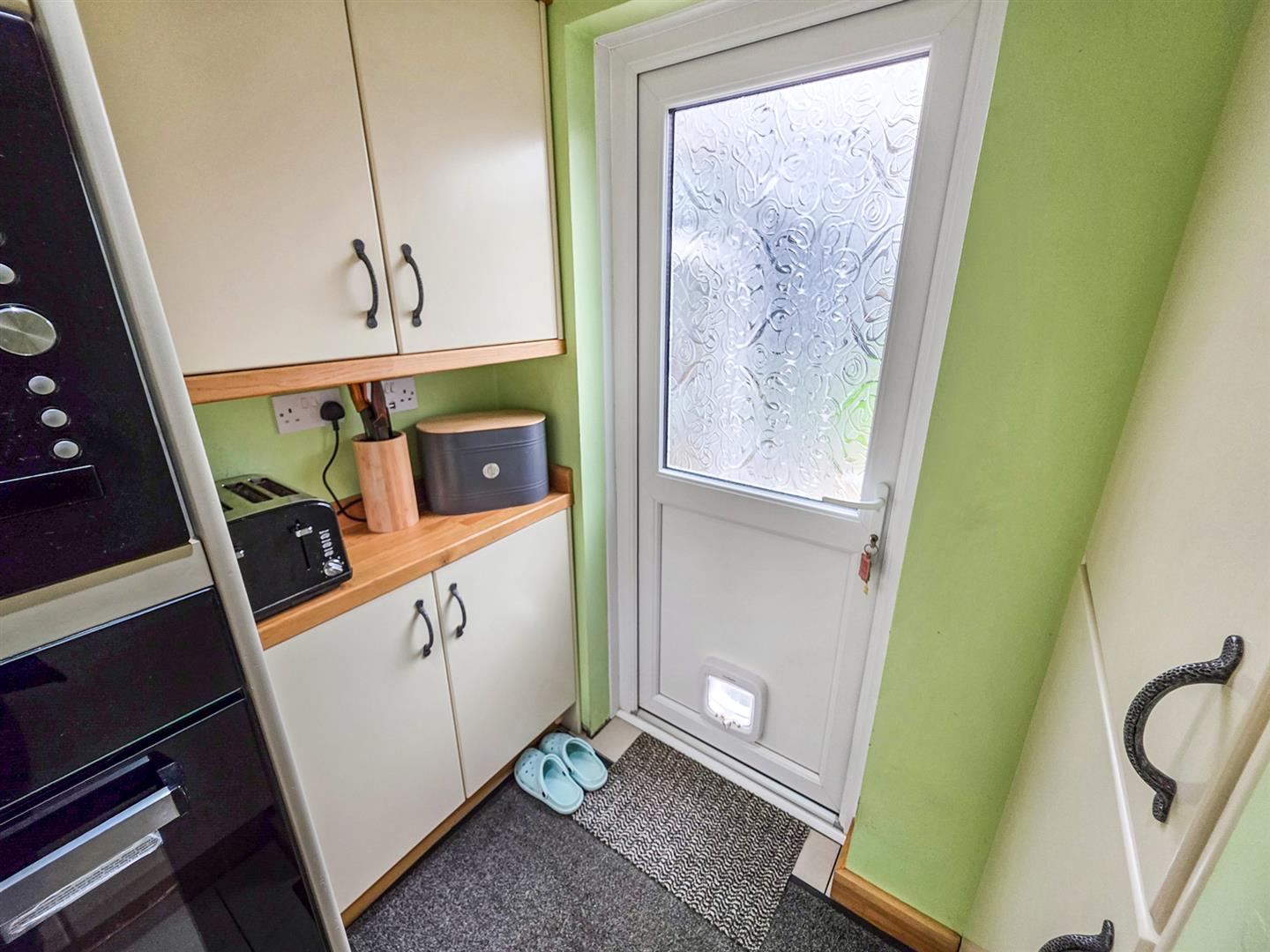 Fitted to comprise a range of base and eye level units with a single sink and drainer, induction hob and electric oven, space for white goods, double glazed window to side elevation and double glazed door to the rear elevation.`