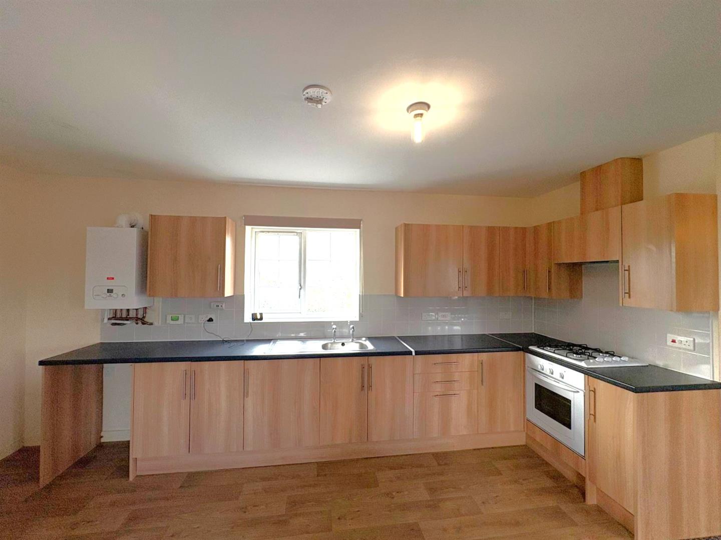 A fitted kitchen comprising a range of wall and base units, single bowl Asterite sink and drainer unit, electric oven and gas hob with cooker hood over, space for a fridge/freezer, partial complimentary tiled splash back and a double glazed window to the front elevation.