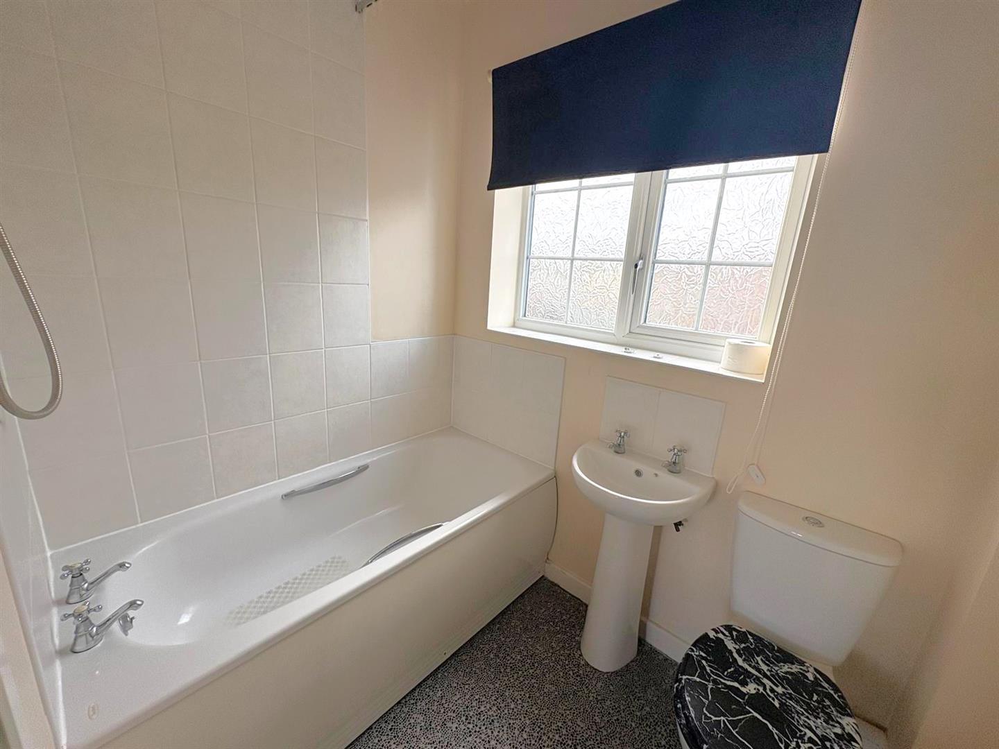 A three piece suite comprising a bath with shower over, wash hand basin and WC. Further features include partial complimentary tiling, wall mounted radiator, extractor fan and an obscure double glazed window to the front elevation.