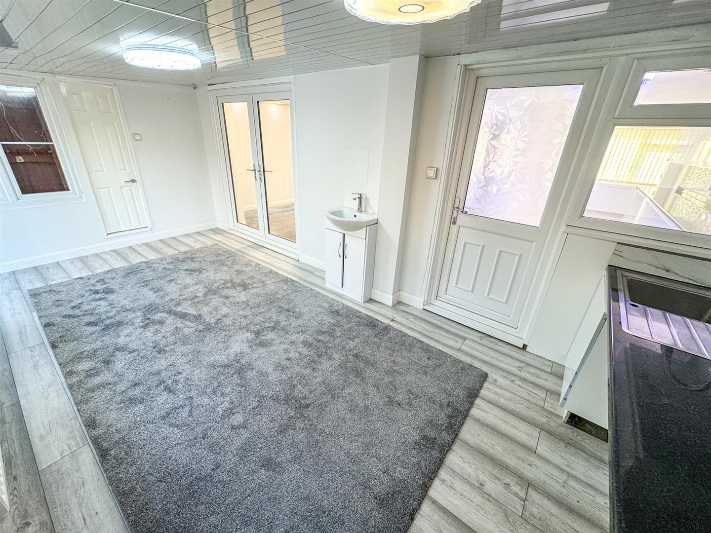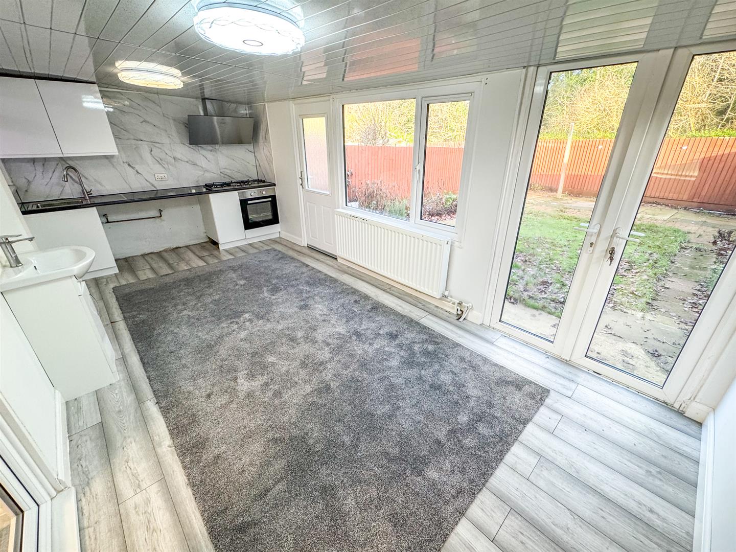Fitted to comprise a range of base and eye level units with a single sink and drainer, gas cooker with extractor, electric oven, radiator, double glazed window and doors to rear elevation, pedestal wash hand basin, door to: