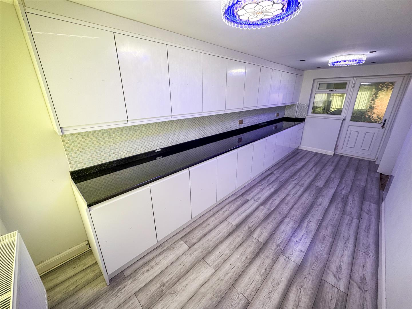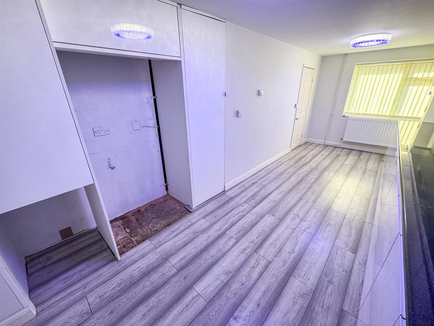 Fitted with base and eye level storage units, double glazed window to front elevation, radiator, under stairs storage, double glazed window, space for American fridge freezer and door to: