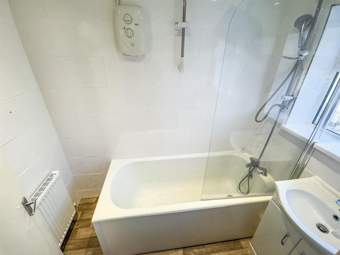 Featuring a two piece white suite with panel bath and electric shower over, low level wash hand basin, radiator, double glazed window to rear elevation.