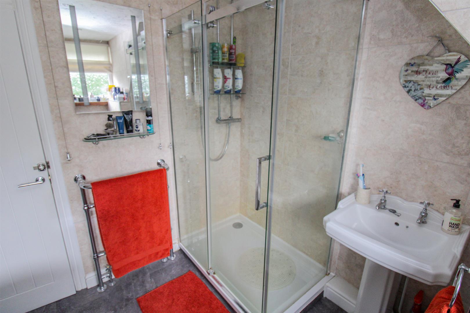Fitted to comprise a four piece white suite consisting of a roll top bath, walk in mains feed shower cubicle, low level pedestal, low level wash hand basin, radiator, ceiling spotlights, double glazed window to rear elevation.