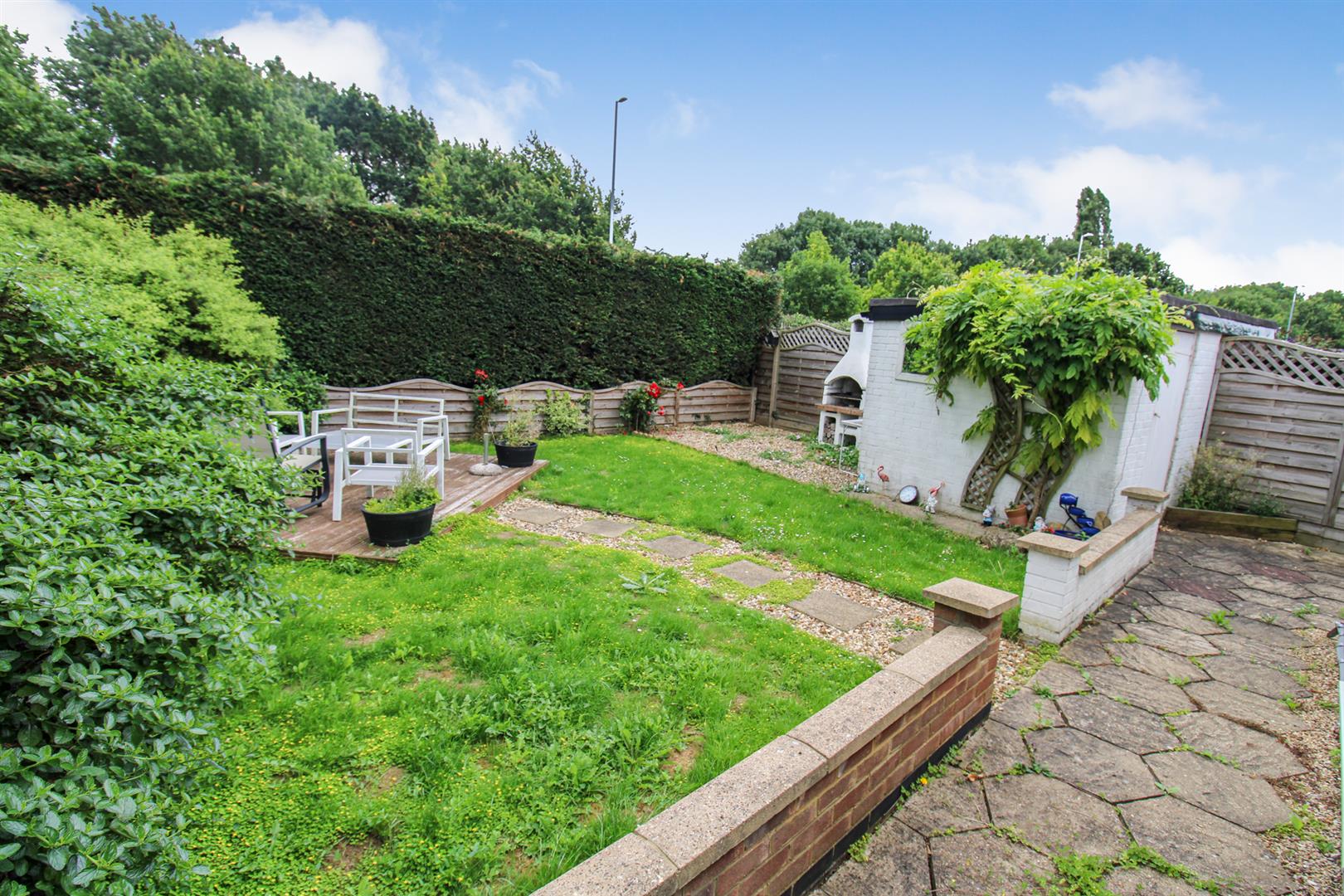 Rear: A large patio area is split to both sides and leads up onto a large lawn that has a raised decking area to one corner, the whole garden is enclosed by timber fencing and privet hedges to all sides.