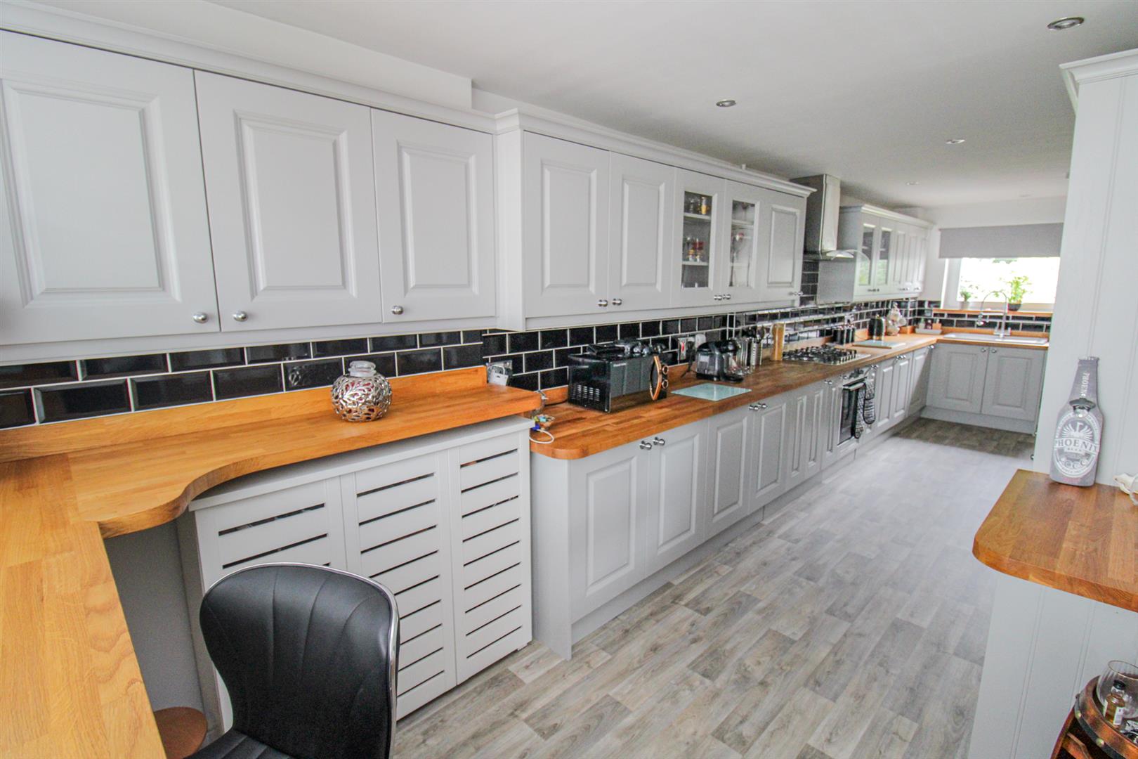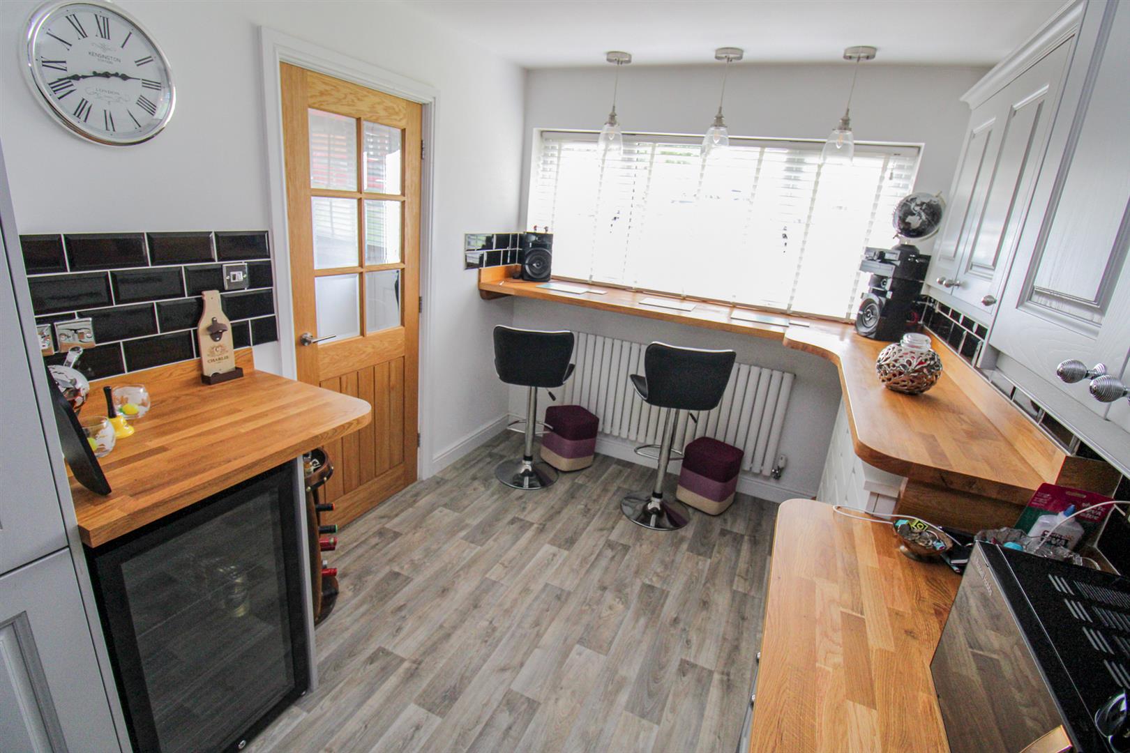 Re-fitted to comprise a range of base and eye level units with a solid Oak work surface, Belfast sink and drainer, five ring gas hob with extractor fan, electric oven, integrated fridge/freezer, integrated washing machine, integrated tumble dryer, space for wine fridge, radiator, ceiling spotlights, breakfast bar, double glazed window to front and rear elevations, Oak door to entrance hall, archway to: