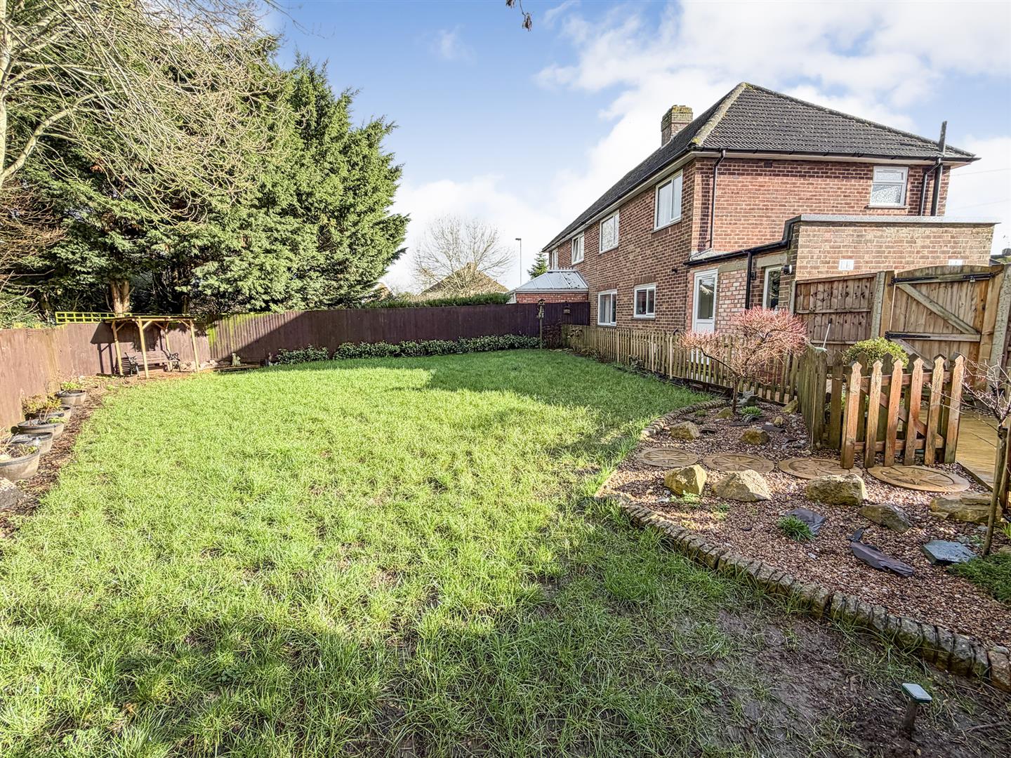 REAR - A pebbled and patio area enclosed by a picket fence, leads to a large laid lawn, pond, mature shrubbery and plants, enclosed to all sides by timber fencing. There is a timber gate providing access to the front elevation.