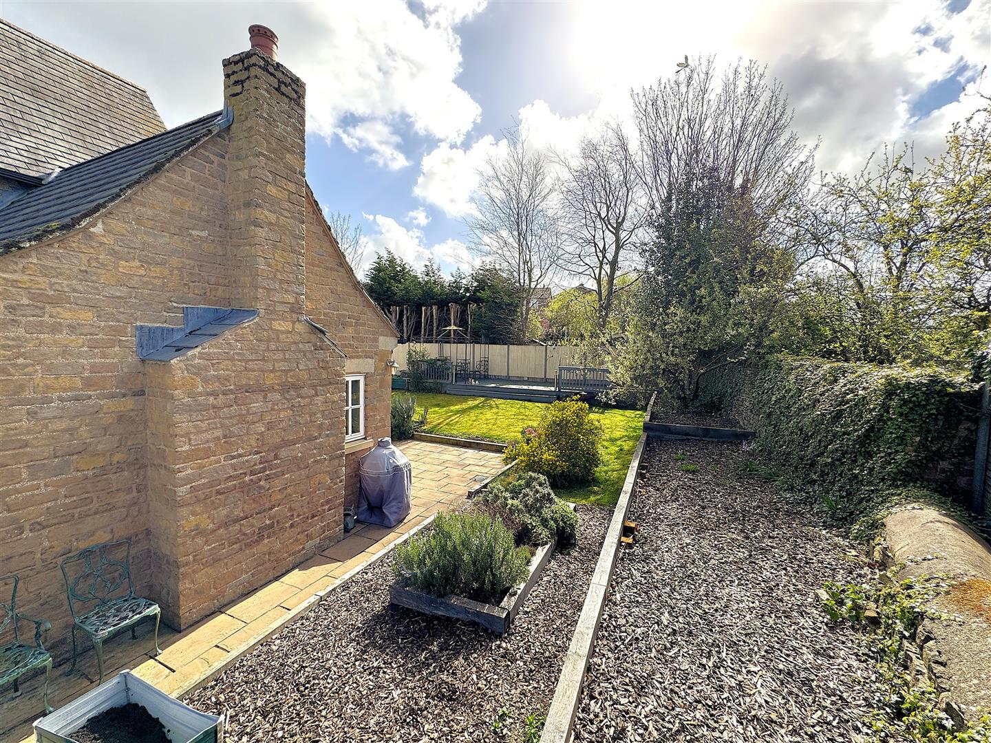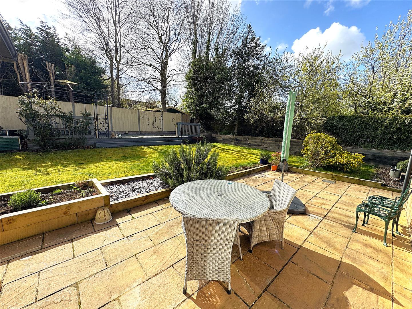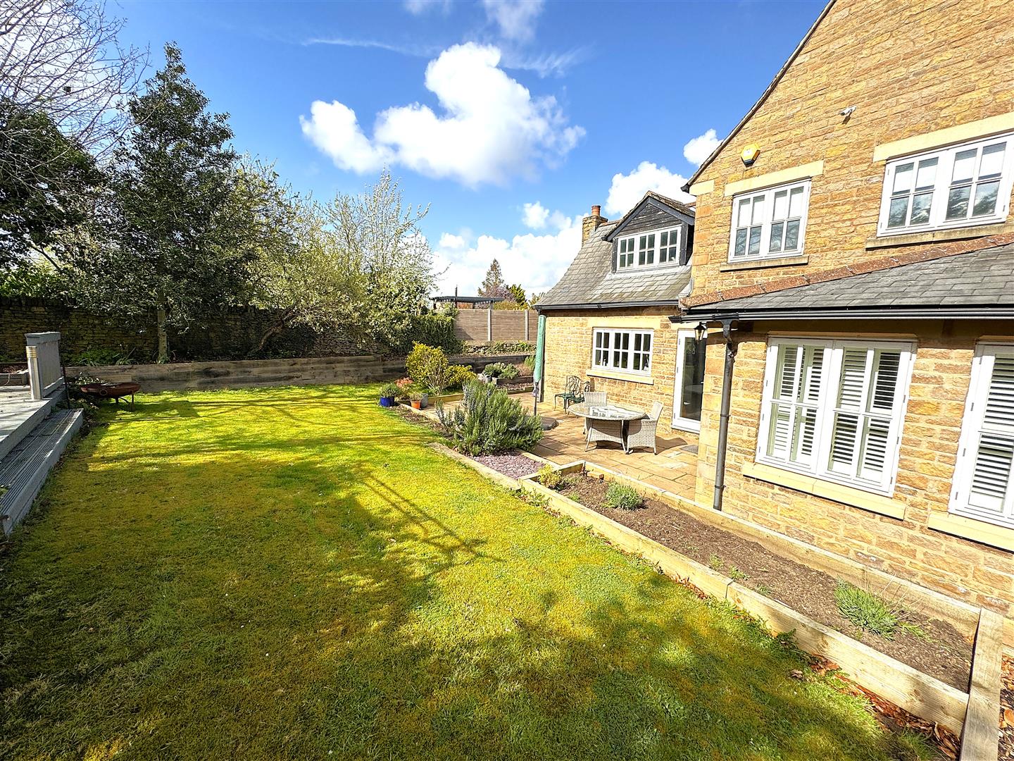 The rear garden has been thoughtfully landscaped to create a private outdoor retreat, with a paved terrace for al fresco dining, a well-maintained lawn, established planting areas, and a timber decked seating area. Enclosed by fencing and stone walling, it provides a peaceful and secluded setting.