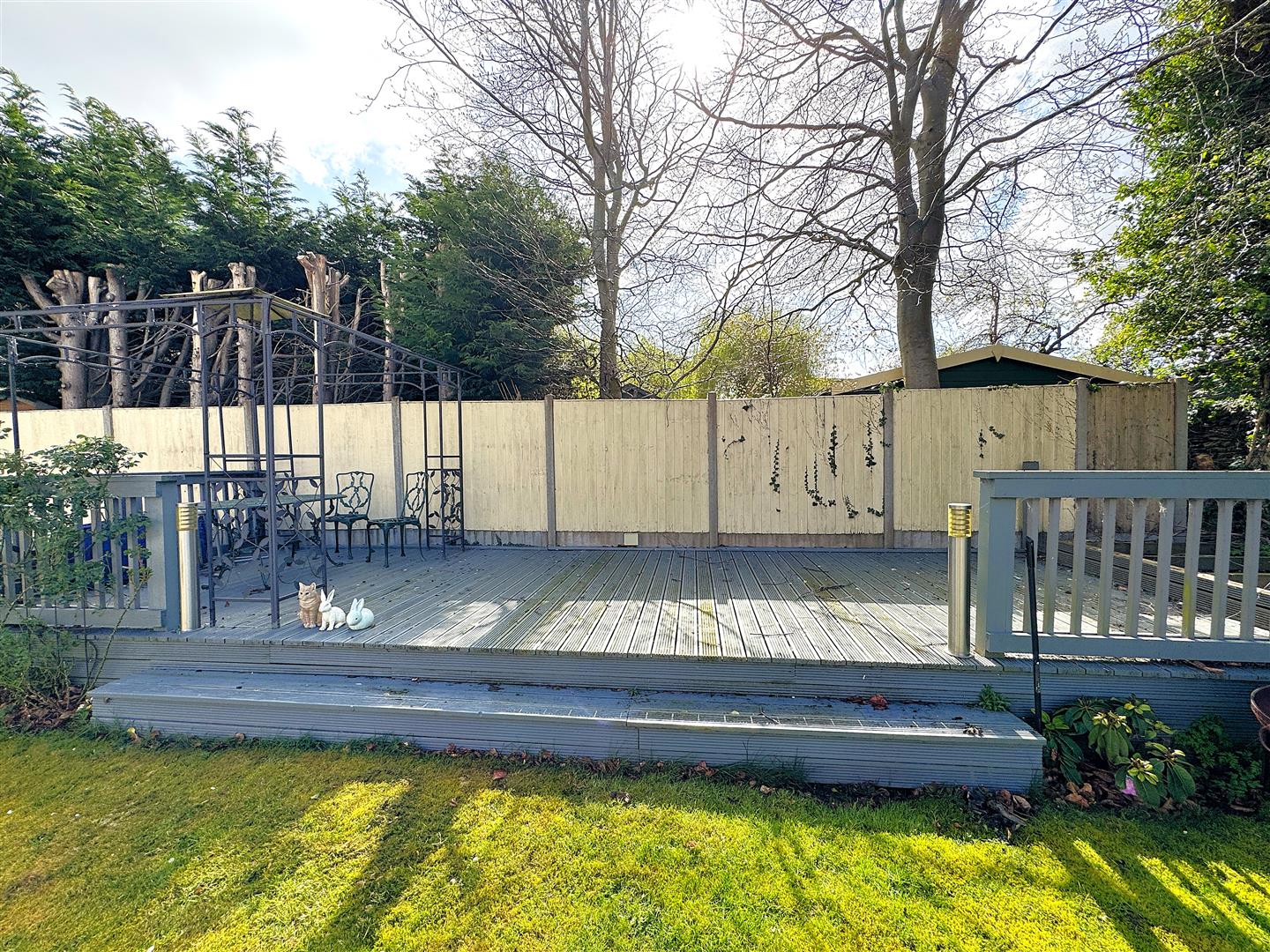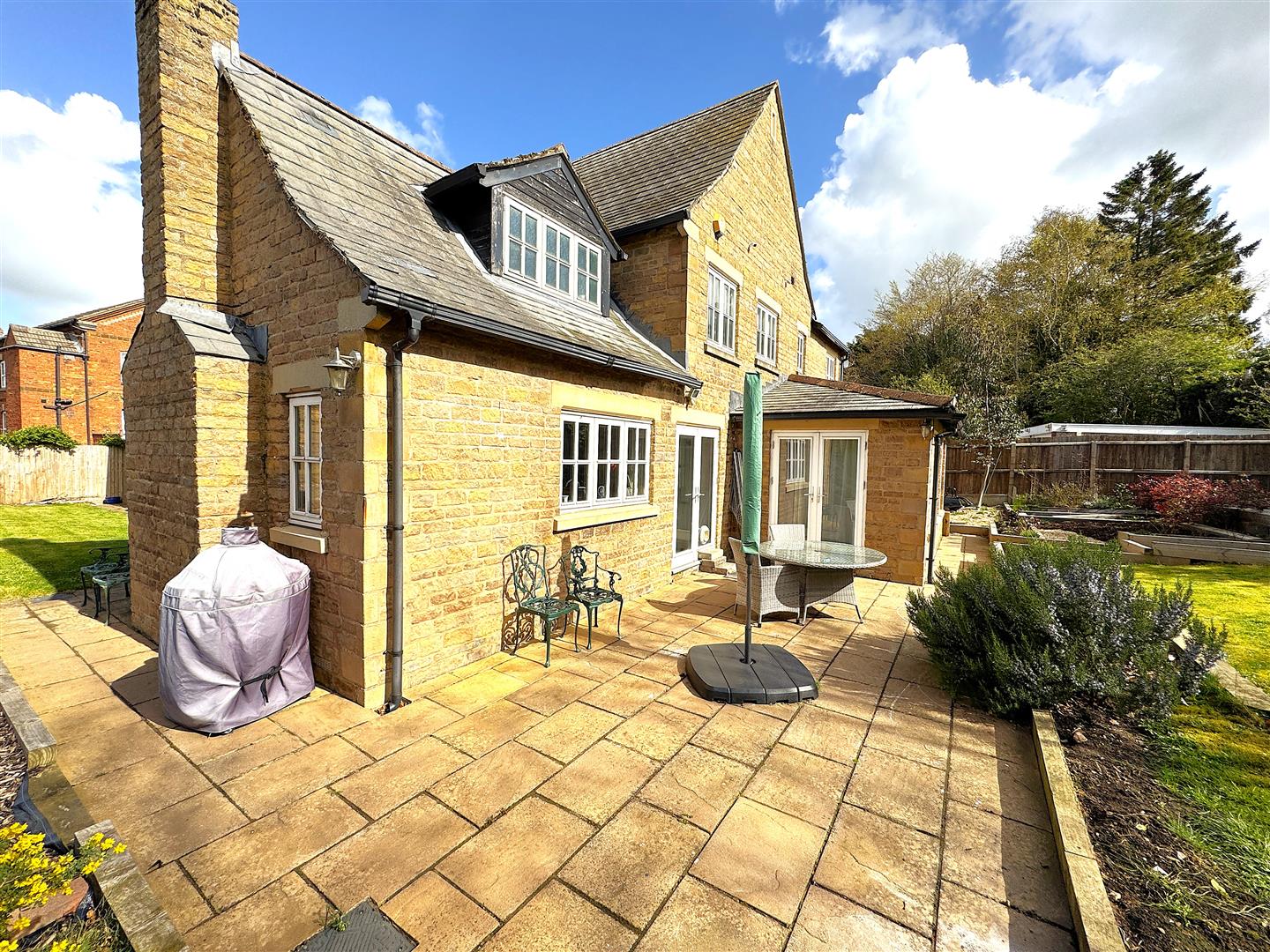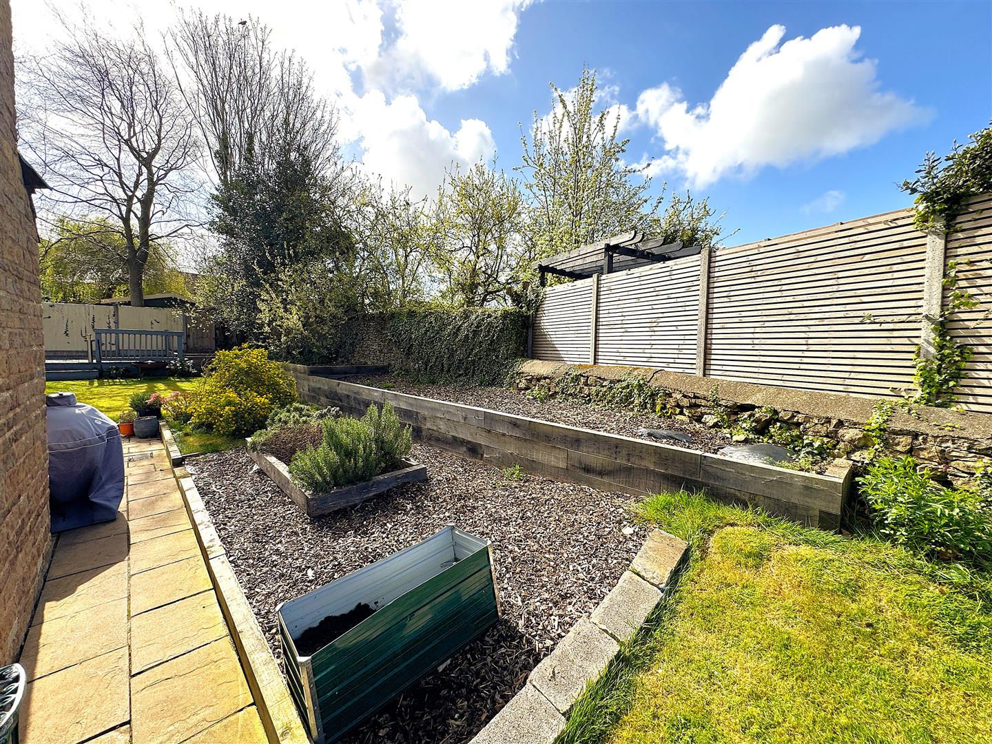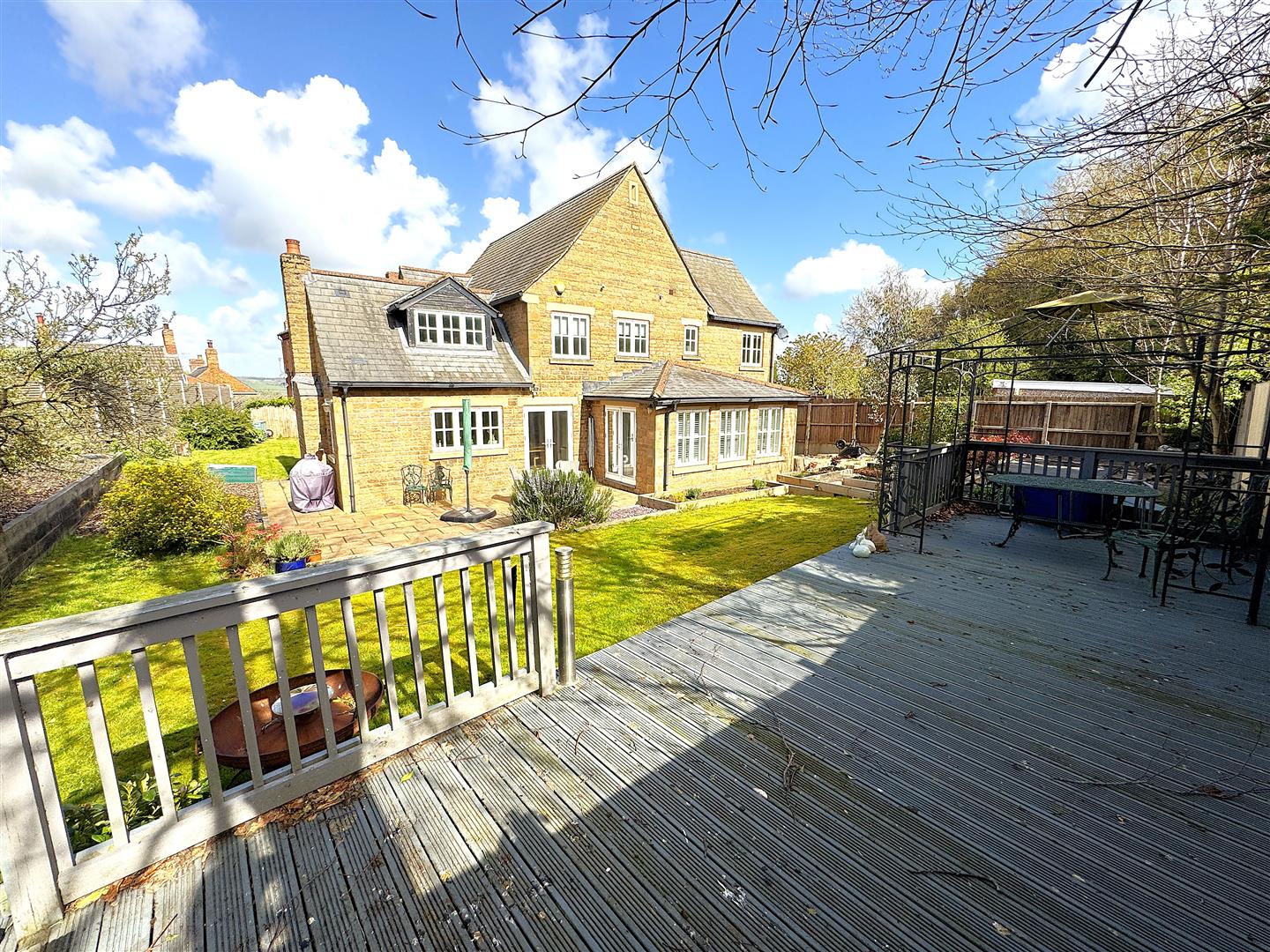 The rear garden has been thoughtfully landscaped to create a private outdoor retreat, with a paved terrace for al fresco dining, a well-maintained lawn, established planting areas, and a timber decked seating area. Enclosed by fencing and stone walling, it provides a peaceful and secluded setting.