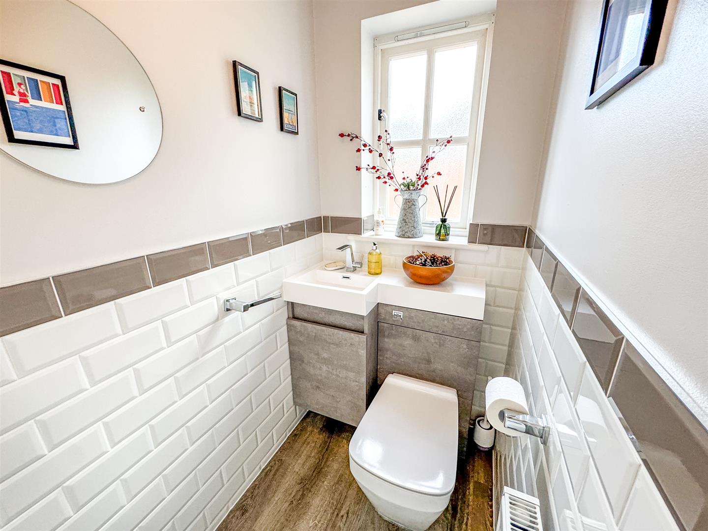 Fitted to comprise a two piece suite consisting of a low level pedestal, low level wash hand basin, radiator, double glazed window to rear elevation.