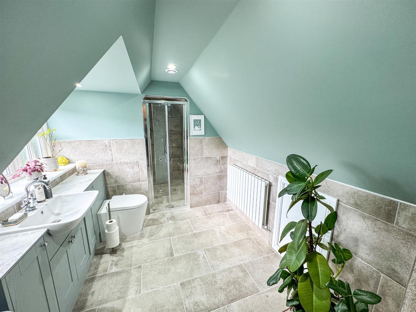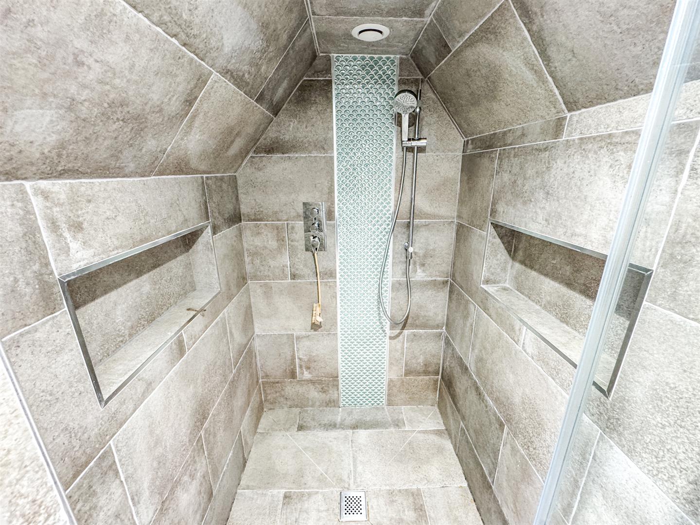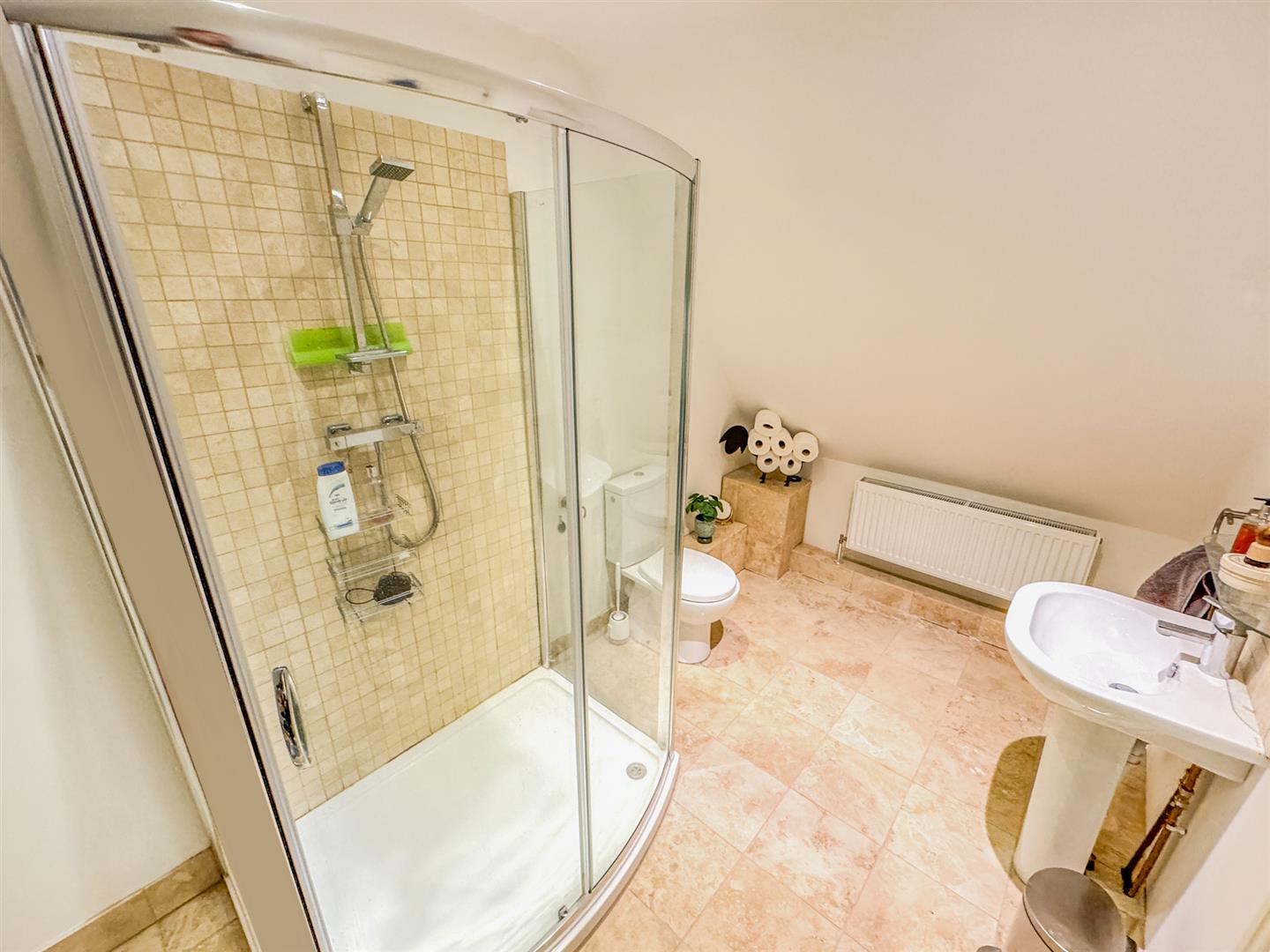 Fitted to comprise a three piece suite consisting of a low level pedestal, low level was hand basin, radiator, door to a fully tiled shower area, extractor.